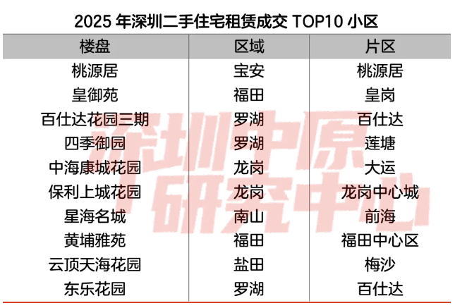 中原则监测到了租赁小区前10的名单,其中宝安的桃源居同样排在第一。