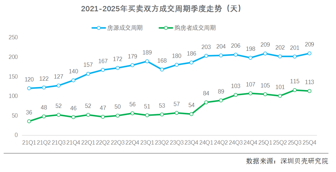深圳贝壳研究院统计,2025年季度成交周期均在200天以上,季度末成交周期为209天,相当于业主挂牌7个月才能成功卖出房源。