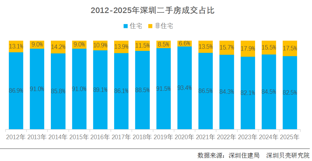 二手房方面,2025年非住宅成交占比为17.5%,同比扩大2%,达到2012年以来次高值。