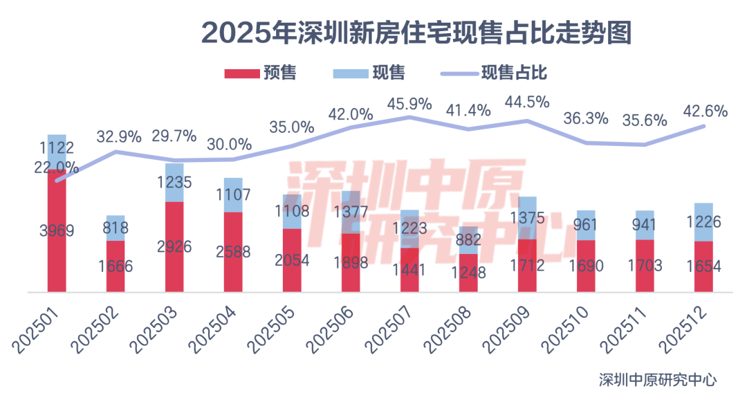 从趋势来看,现售比例不断上升,2025年成交占比已达到35%。另外聚焦到12个月来看,其中6/7/8/9/12月的现房占比更是超过四成,这意味着现房时代在加速到来。