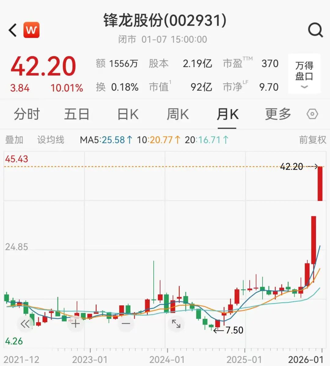 1月7日,锋龙股份(002931.SZ)延续狂热走势,再度一字涨停,截至午盘,股价报42.2元/股,封板资金达24.2亿元,这已是该公司自2025年12月25日复牌以来的连续第8个一字涨停板,区间累计涨幅达114.43%。