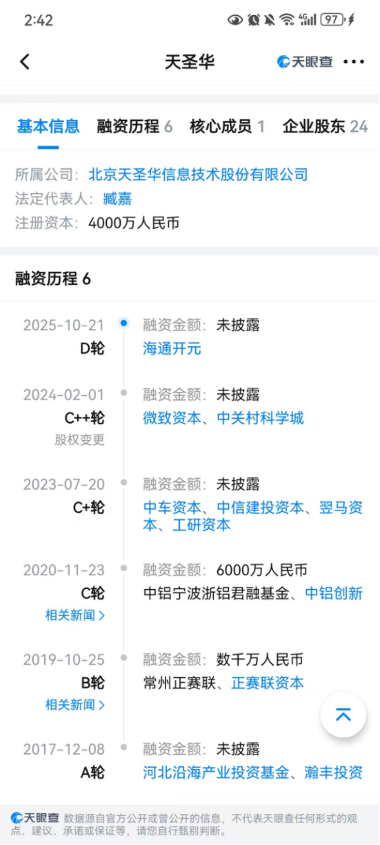 其最新一轮融资发生在2025年10月,在天圣华的D轮融资中,获得海通开元的投资。