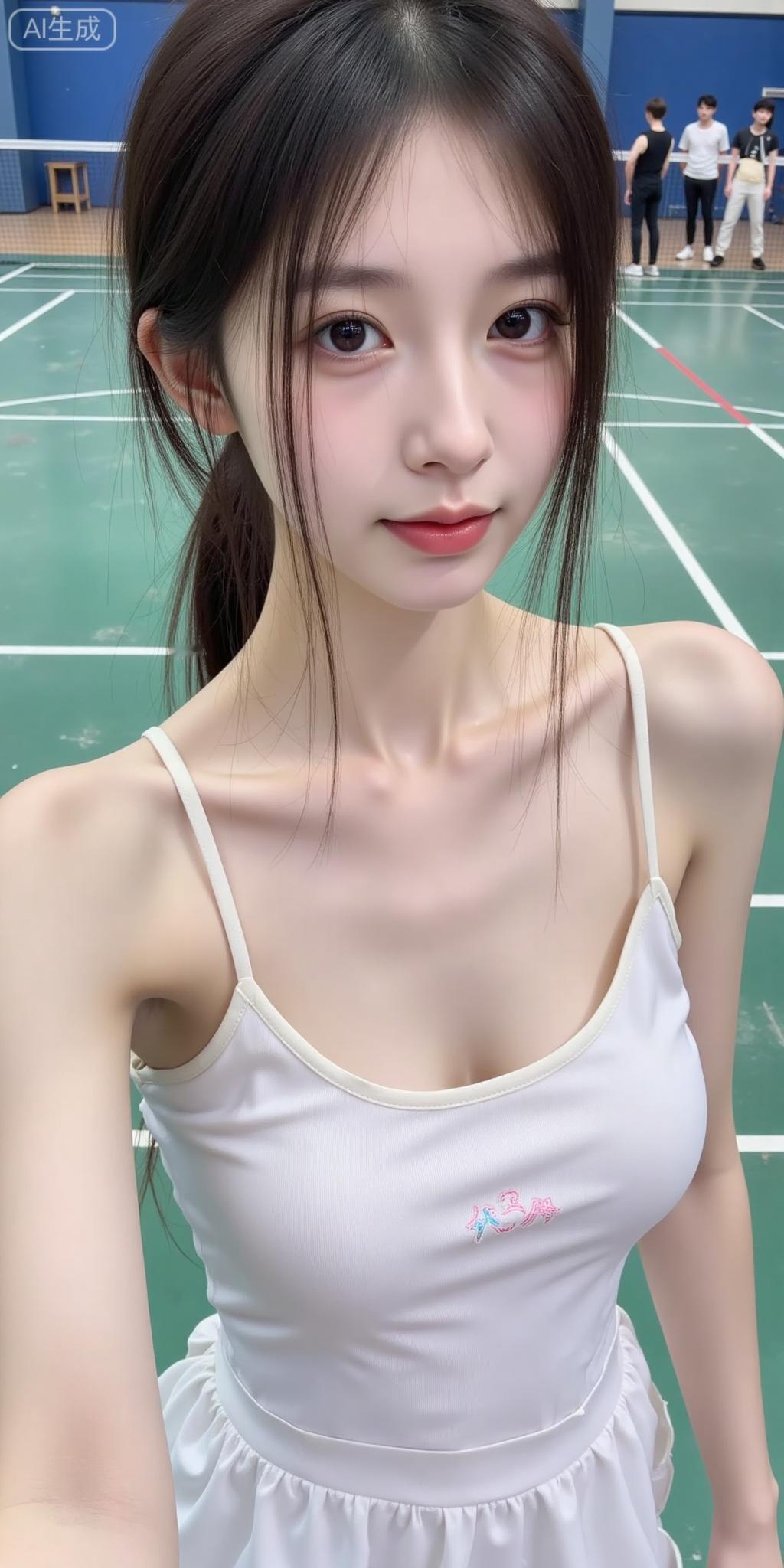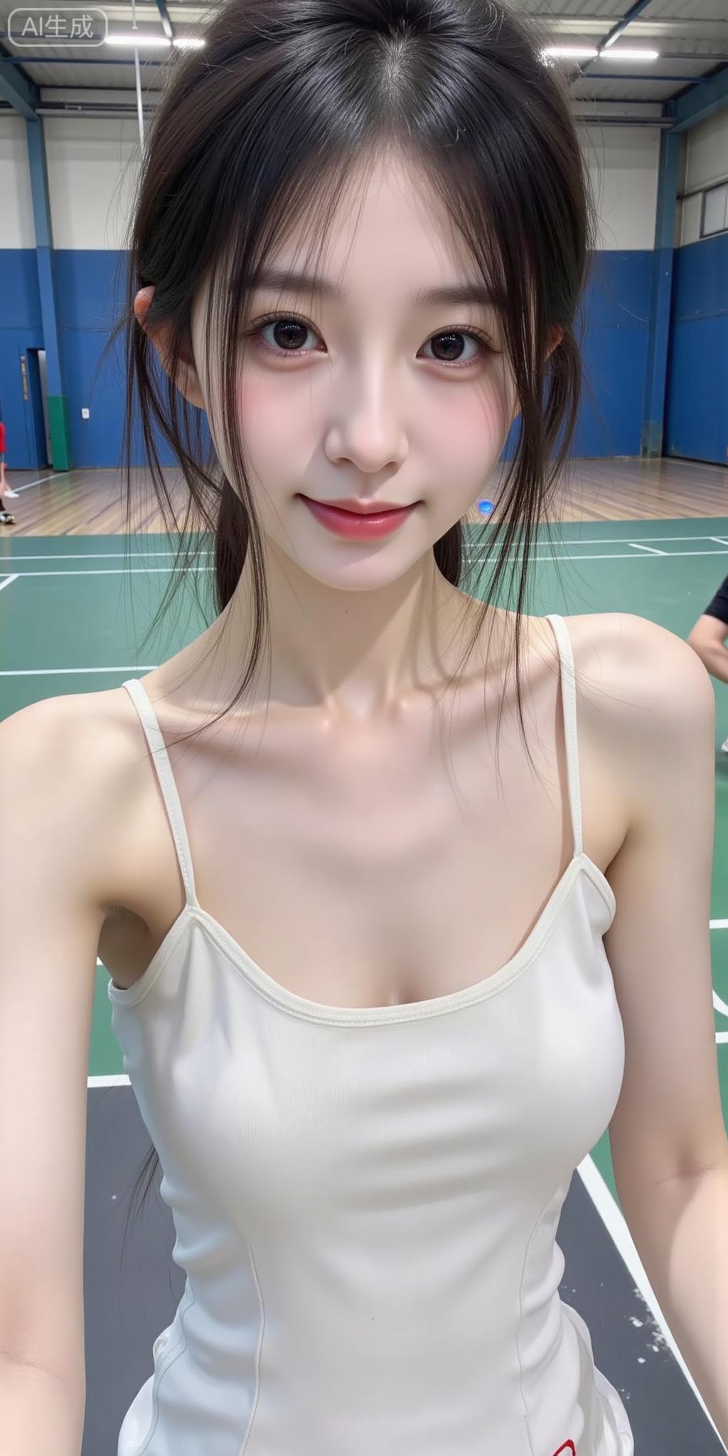 健身房偶遇活力女孩!吊带背心配卡通图案,黑发红唇笑容超甜。运动场绿地上,她自信舒