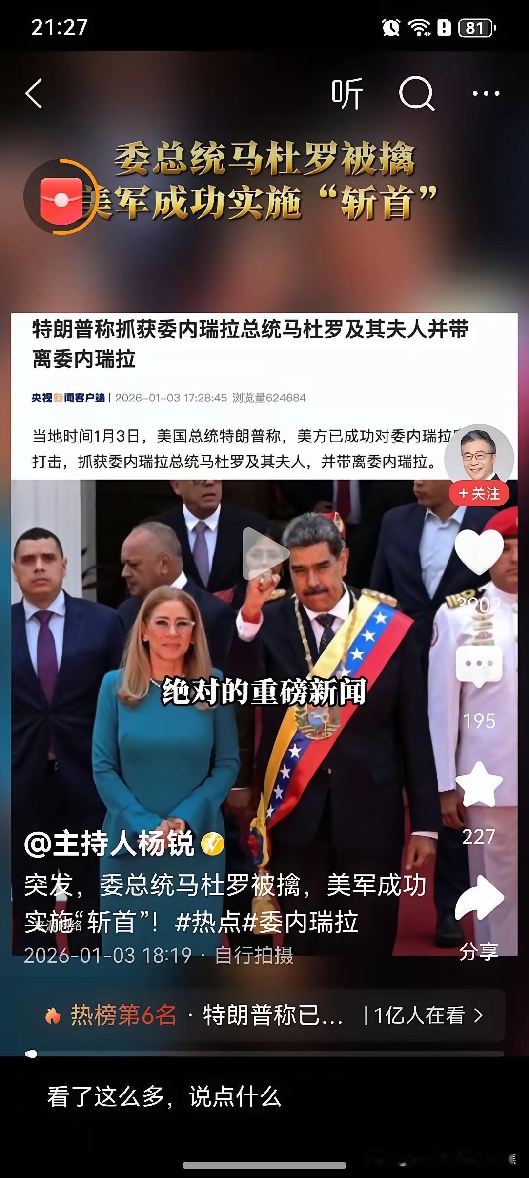 2026年感动世界的爱情故事。美军原本只强掳马杜罗,但其夫人西利娅·弗洛雷斯强硬表态:“如果你们要强掳他,那你们也得带走我”。 夫妻本是同林鸟,大难临头各自飞。马杜罗夫人感动了我,感动了世界!你是风儿我是沙你是风儿我是沙缠缠绵绵绕天涯 你是风儿我是沙缠缠绵绵绕天涯 珍重再见今宵有酒今宵醉 对酒当歌长忆蝴蝶款款飞 莫再留恋富贵荣华都是假 核心事实:2026年1月3日,美军对委内瑞拉发动军事打击,强行抓走马杜罗夫妇,引发国际社会强烈谴责。行动中,美军原本只强掳马杜罗,但其夫人西利娅·弗洛雷斯强硬表态:“如果你们要强掳他,那你们也得带走我”。 行动细节: 时间地点:美军于美东时间1月3日1时01分(加拉加斯当地时间2时01分)突袭马杜罗在军营的住所。 执行部队:由美军三角洲特种部队执行,美国联邦调查局特工小组协同行动。 过程:马杜罗夫妇被从卧室拖出带走,撤离过程中与委方多次交火。 后续影响:事件引发国际社会强烈谴责,美国国内多地出现示威活动,反对美国以武力手段颠覆别国政权。 1.凯恩披露抓捕过程 2.特朗普下达突袭命令 3.行动涉及飞机数量 4.马杜罗夫妇被带至美军军舰 想深入了解马杜罗夫人西利娅的背景?这里有份她的政治生涯时间线,帮你快速看懂这对“权力夫妻”的关系脉络。
