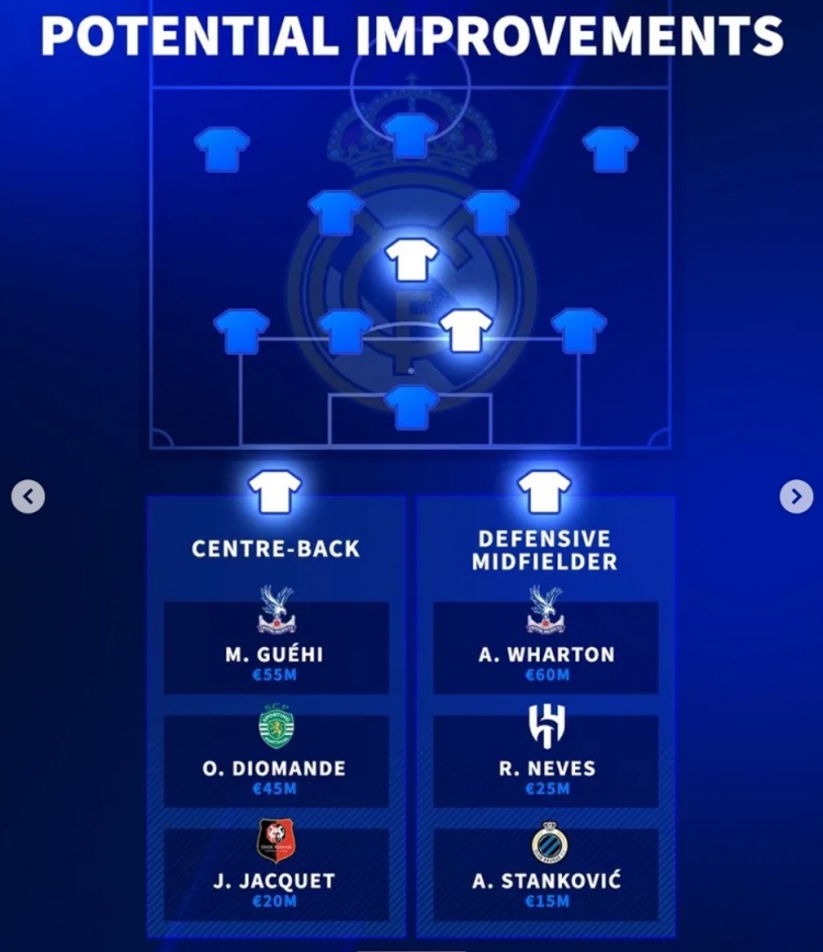 直播吧1月7日讯冬窗已至,《转会市场》也列出了皇马的潜在补强位置、目标人选及其身价: