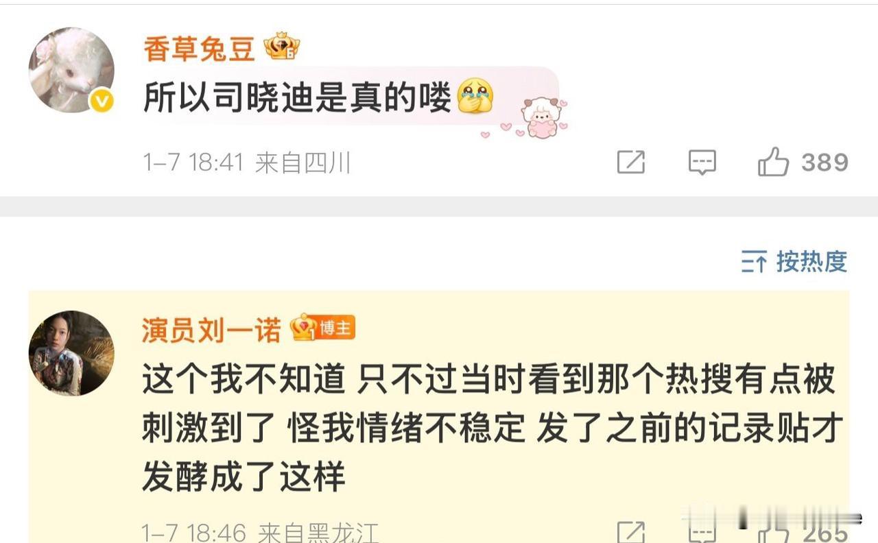 1月7日,刘一诺回复网友,之所以发恋情记录图文是因为被司晓迪的事刺激到了,一时没
