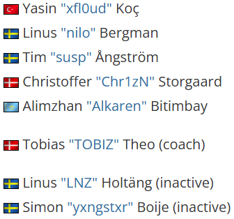 随着他的签约,战队在用Christoffer"Chr1zN"Storgaard替换Linus"LNZ"Holtäng,并保留Yasin"xfl0ud"Koç、nilo和Alimzhan"Alkaren"Bitimbay核心阵容后,已恢复至满编五人。