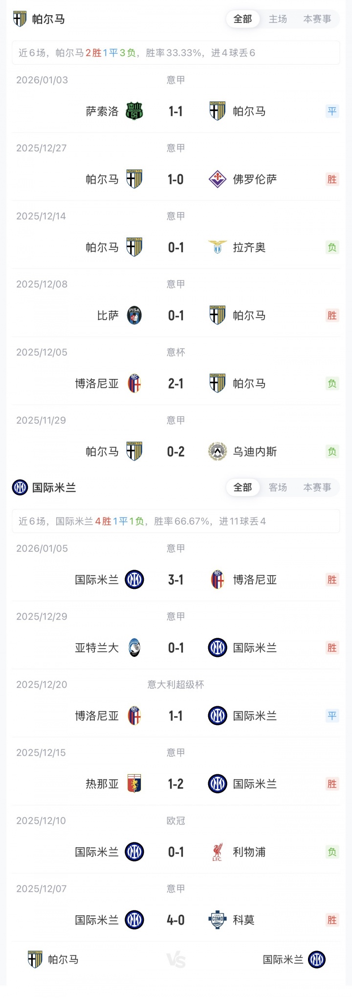目前17轮比赛过后,国米13胜4负积39分领跑积分榜;帕尔马4胜6平7负积18分,暂列积分榜第15位。