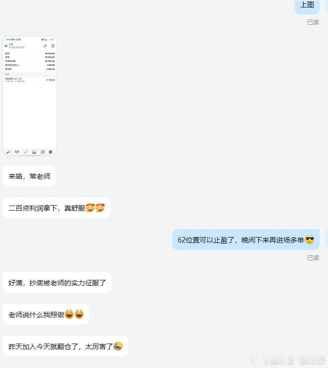 实盘喜讯分享恭喜实盘全体兄弟姐妹们完美拿下二百点利润,给力,这一刻一切都值得了!这位实盘兄弟这下可以彻底放心了,他是昨日两位同时加入的一位,昨天和今天都是分享他的账号持仓情况,昨日晚上就已跟上操作但大家都知道昨天的情况,行不行好不好老常说了不算,昨天跟上操作的兄弟们和行情会替我回答,也无需我多说,利润和时间会一直帮我证明一切!当然,这只是刚刚开始,继续期待着吧,更大的福利和惊喜还在后面,给我冲!!!黄金金价