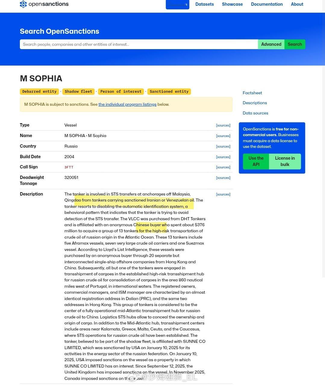 今天美军在加勒比海海域劫持了另一艘油轮,该船为注册于辽宁营口并悬挂巴拿马国旗的“M Sophia”号,因参与委内瑞拉和伊朗的石油贸易活动而被美国政府非法制裁。该船在五个半月前就关闭了AIS应答器,事发时可能正在离开委内瑞拉驶往中国。