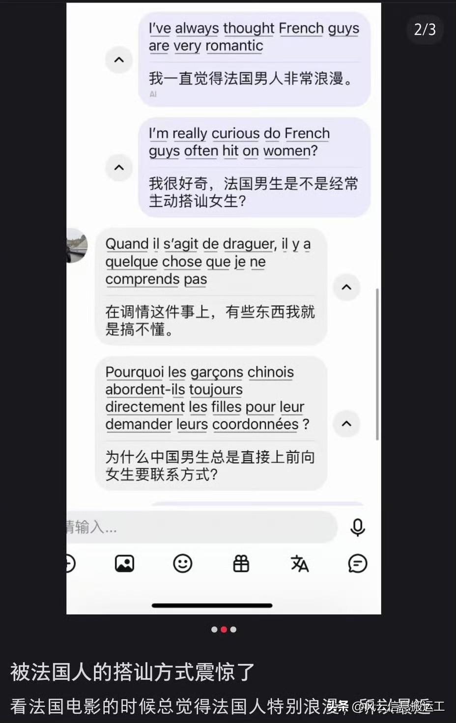 一网友发帖说法国人很浪漫,法国男人如果喜欢一个女生会主动把联系方式给她,让对方自行决定加不加,而不是像中国男人一样直接上去就问女生的联系方式,感觉很冒犯。 然后一法国妹子评论:你错了,这是在让女性承担所有事情,这是懒惰,不体贴,而不是浪漫。