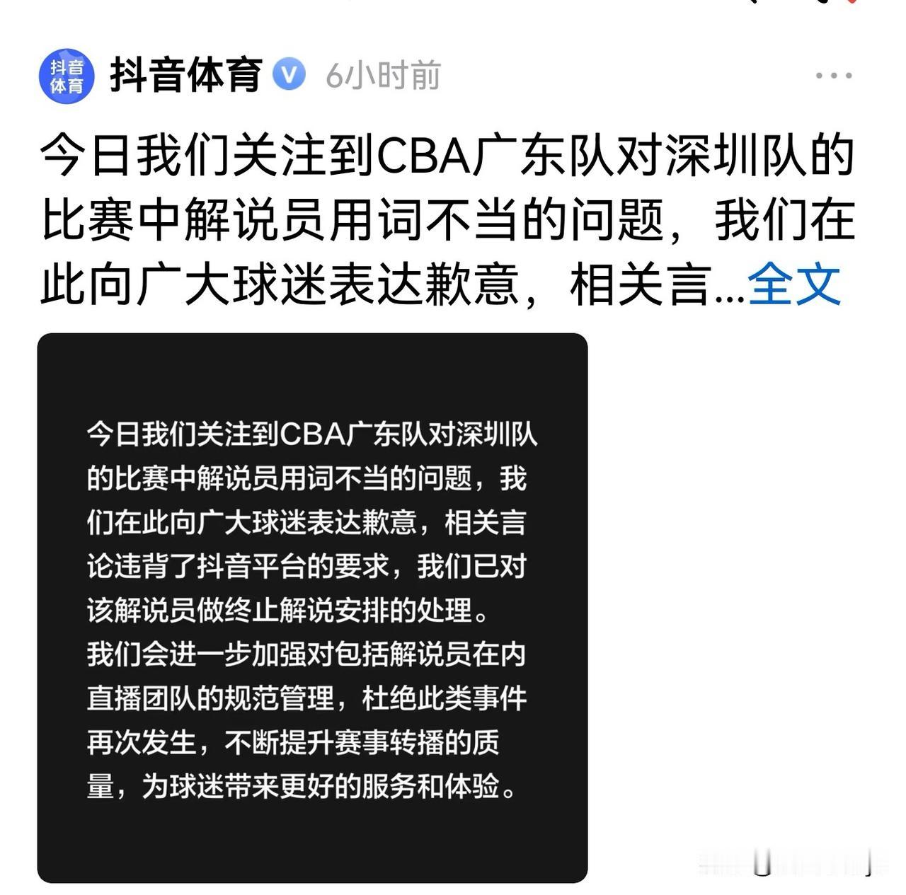 新赛季,CBA联赛里,有些解说员的表现真让人一言难尽,隔着屏幕真想一巴掌儿呼死他。 伤害性不大,侮辱性极强,喋喋不休,没完没了,嘴碎遭人烦,话多讨人嫌。 就像昨晚广东德比战,广东宏远对阵深圳的比赛,双方三分对飙,命中率超四成,全场比分紧咬,悬念贯穿终场。犹如一场视觉盛宴,充满了刺激和挑战。 可某音体育的解说员倒好,比赛第三节,广东队员要球时,他竟内涵队员,说像猿类啼叫、误入花果山。解说瞎唠偏了岸,还拿地域来添乱;不是心坏心眼暗,就是脑子缺根弦。 还好某音反应快,公开道歉并终止其解说资格。 希望CBA个别解说员及直播CBA赛事的个别网红大咖得有点职业素养和道德底线,别让好好的比赛毁在嘴上,该说的说,不该说的打死都不说。 (图片素材来自网络)