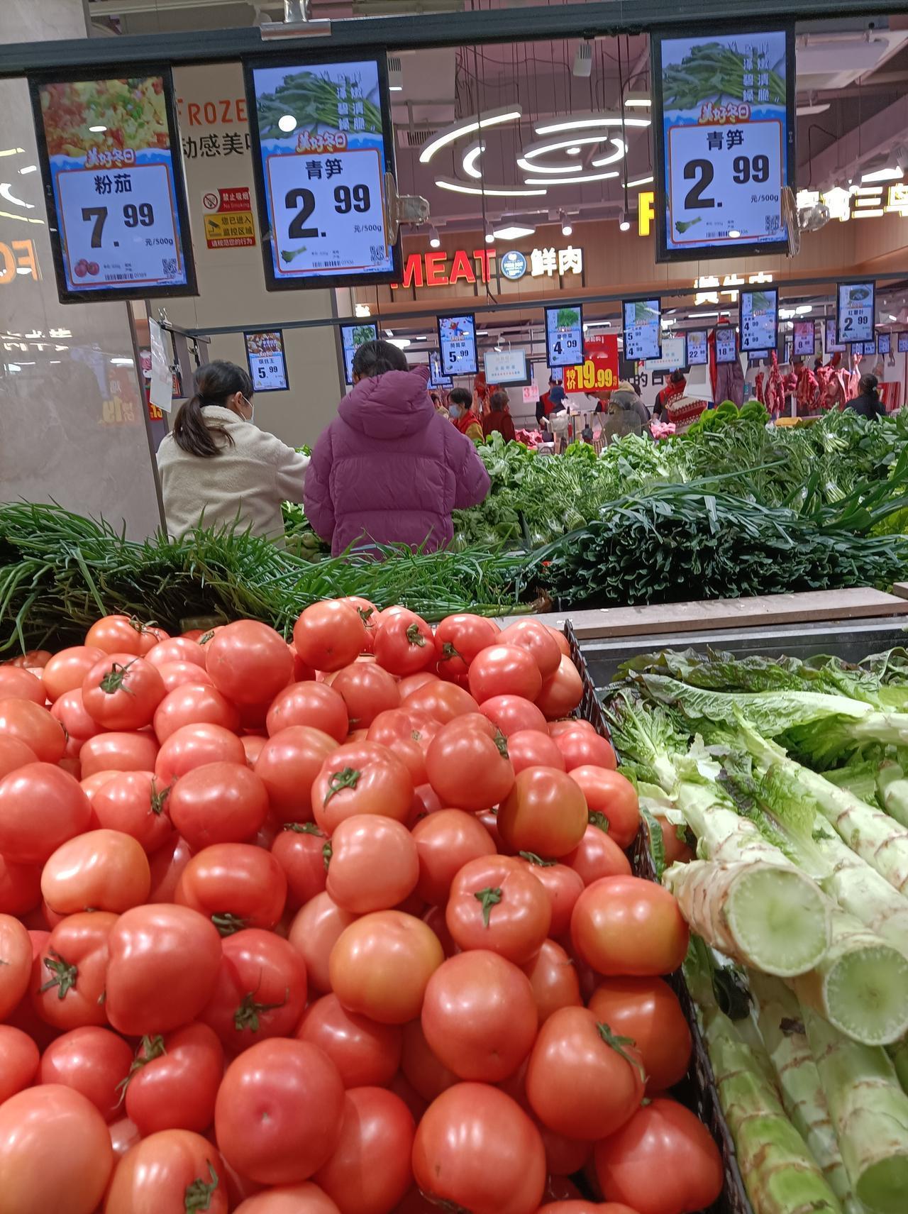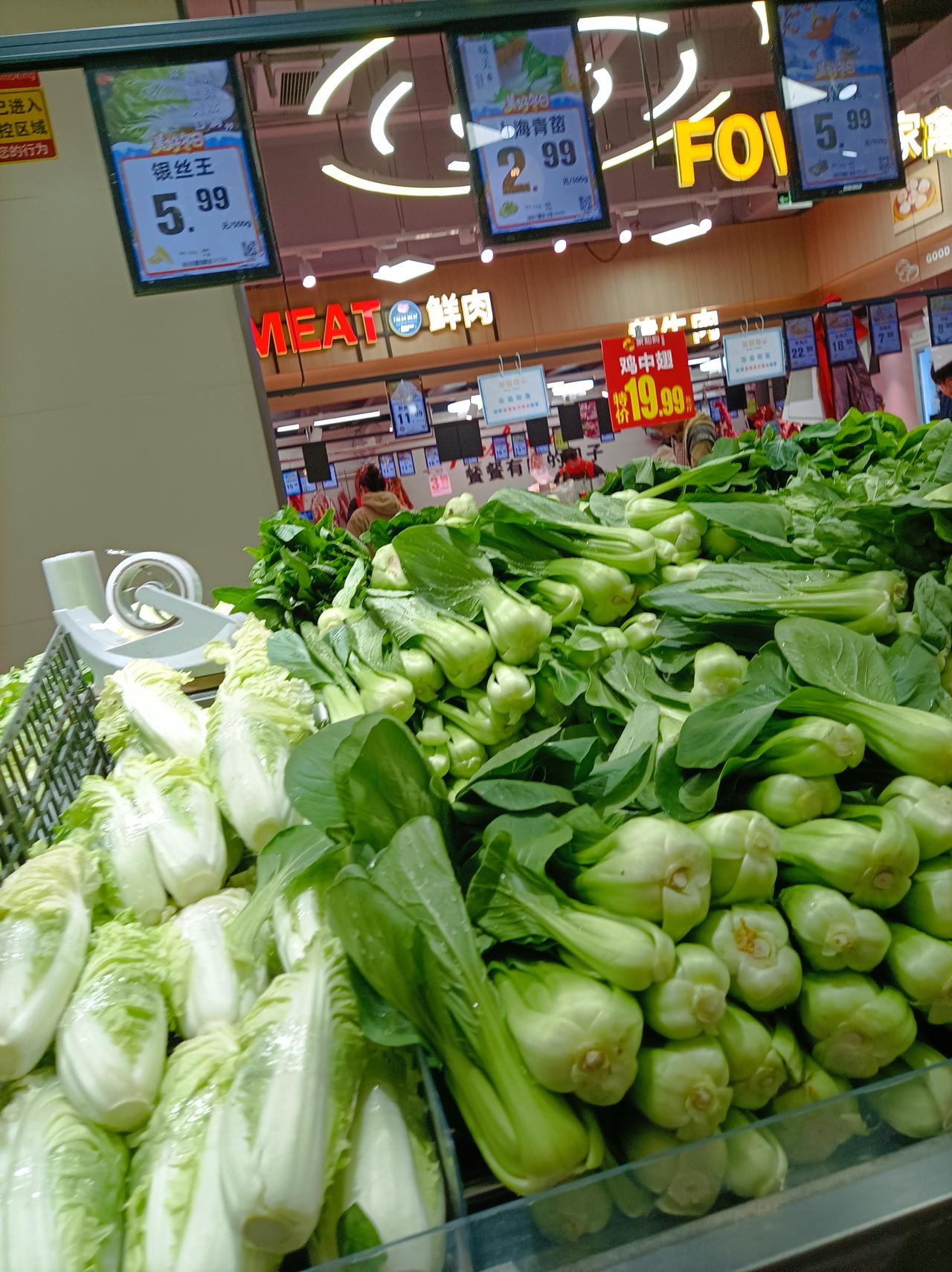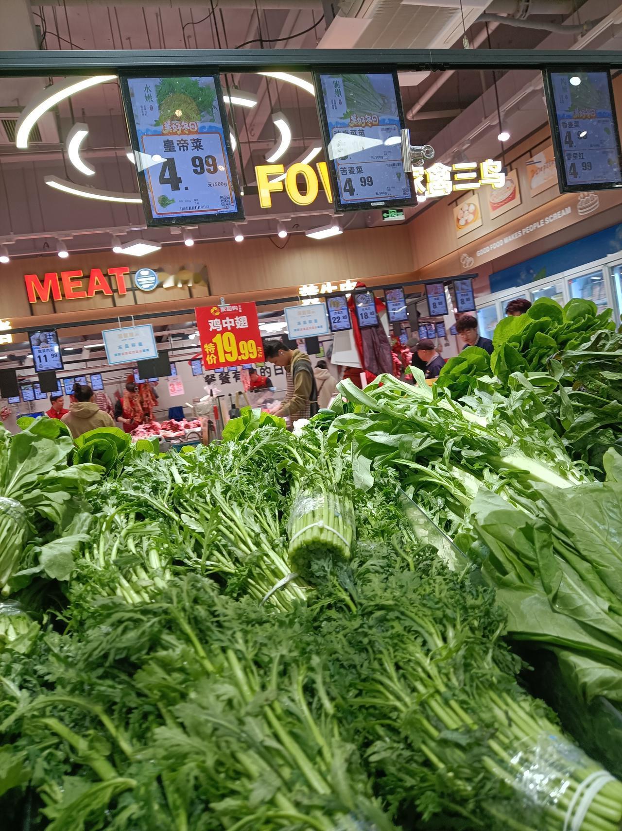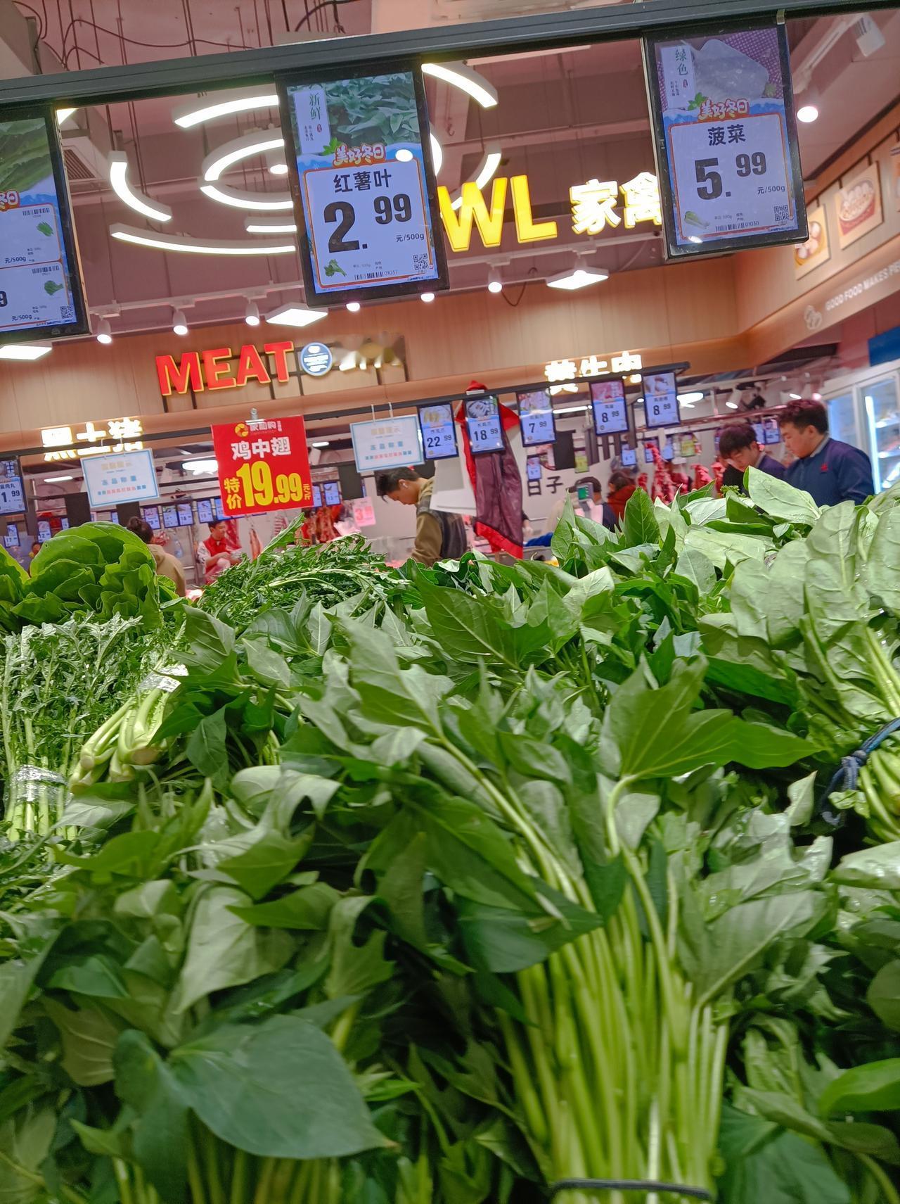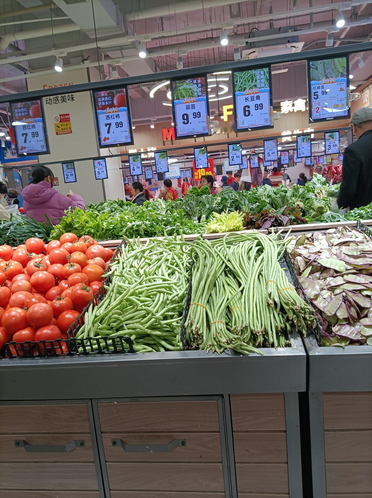 随手拍张照三天没去超市了,今天去了下超市,看今夭的莱价还是有点貴:西红柿7.99元1斤,蒜薹9.9元1斤,长豆角6.99元1斤,小香芹9.9元1斤,皇帝菜4.99元1斤,今天上海青苗便宜,2.99元1斤,红薯叶也是2.99元1斤,奶白菜4.99元1斤,白花菜2.99元1斤,菠菜5.99元1斤