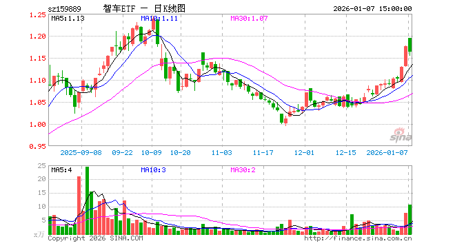 1月7日,智能汽车ETF(159889)跌1.11%,成交额1246.43万元。当日份额增加300.00万份,最新份额为4240.08万份,近20个交易日份额增加300.00万份。最新资产净值计算值为4929.52万元。