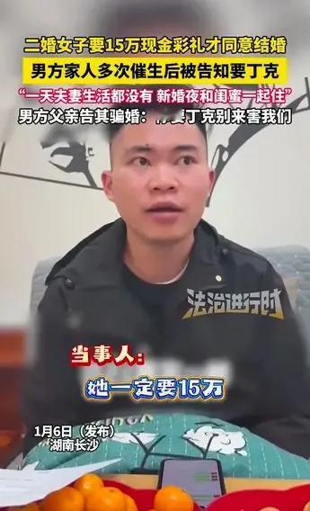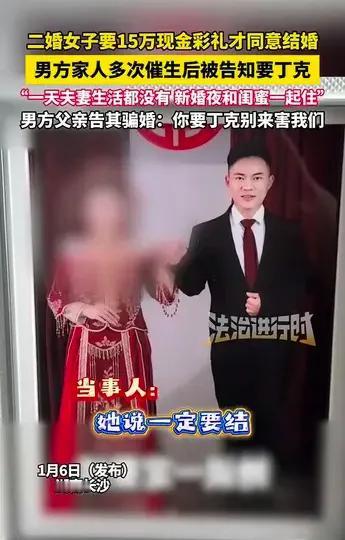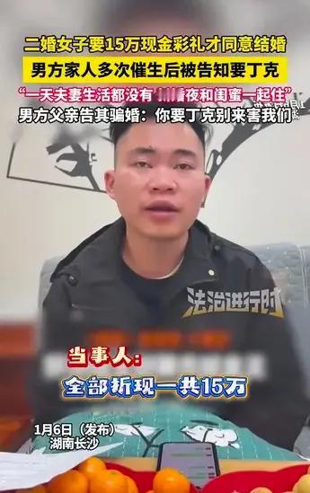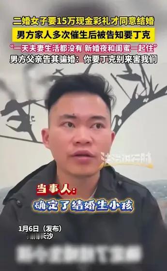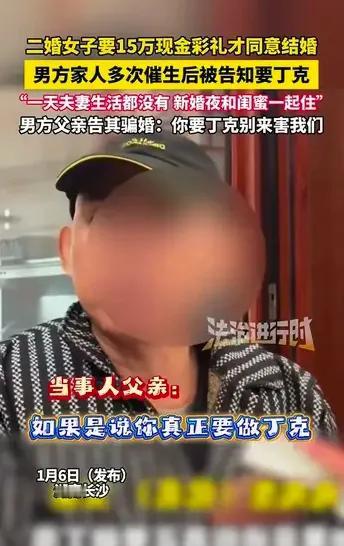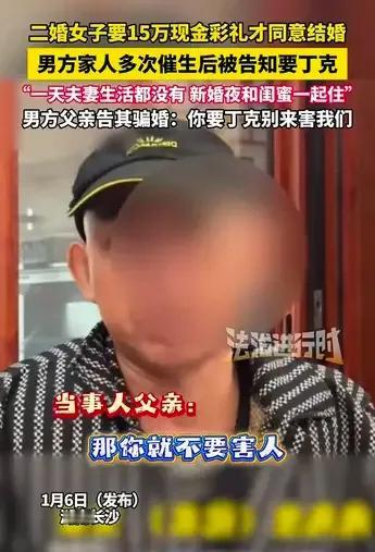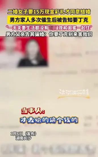 这个女的真的太过分!利用光棍的心理弱点,骗彩礼。长沙一男子经媒人介绍认识了一个二婚女,带着一个女儿。结婚的时候女方要十五万的彩礼只要现金。可是婚礼的当天夜里,女的就和闺蜜住在一起。 男方说结婚到现在两个人没有夫妻生活。 后来女方又要丁克。不再生孩子。这一点是男方家里无法接受的。大龄青年结婚不就是想有个老婆,有个孩子好好过日子吗?娶个二婚女,彩礼花15万,还不生孩子。还没有一天实质性的夫妻生活。男方的父亲说,你要丁克,你就不要来害我们家。事先答应生孩子的现在彩礼拿到手了又反悔了,这不是妥妥的骗婚吗?大龄未婚男青年本来结婚就很难,还这样就欺骗人家真是丧尽天良。