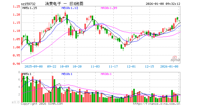 1月8日,消费电子ETF(159732)开盘跌0.60%,报1.160元。消费电子ETF(159732)重仓股方面,立讯精密开盘跌0.92%,胜宏科技跌0.07%,京东方A跌0.23%,兆易创新跌1.33%,豪威集团跌0.48%,歌尔股份跌0.54%,东山精密跌0.37%,TCL科技涨0.00%,蓝思科技跌1.50%,长电科技跌0.72%。