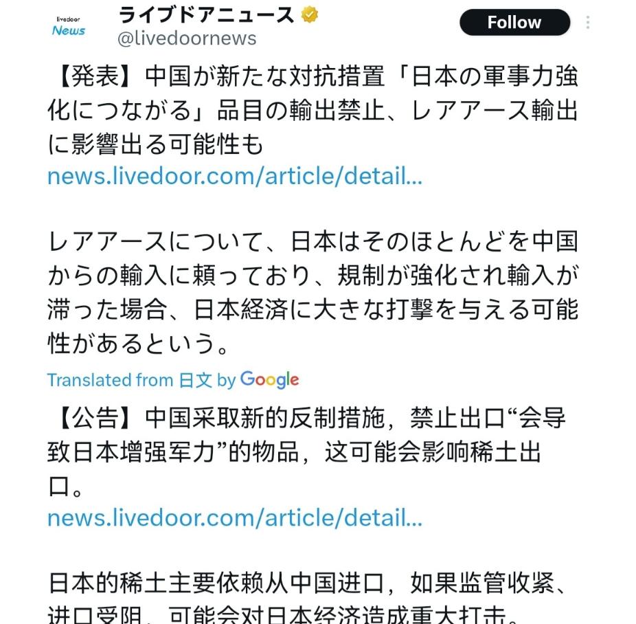 没想到日本反应情绪如此之大! 在我们严格管控军民两用物资对日本进行反制之后,日本国内情绪非常激动。有日本网友就说,这样的管制措施比当年欧洲对付中国的瓦森纳协议管制还要严格。中国对日本禁运的军民两用商品,目录就列了一百多页。有人就表示,中国这是正式宣告,要么高市早苗收回她关于台湾的讲话,要么高市下台,中日关系没可能改善。 日本为啥这么慌?答案就藏在他们自己的进口数据里。日本有一千四百多个进口品类,超过一半的货都得从中国进,军工相关材料的依赖度,比民用的还高得多。 中重稀土咱就不说了,日本几乎 100% 靠进口,而且大多来自中国。镓和锗的依赖度,也分别冲到了 85% 和 90% 以上。这些东西不是普通的工业耗材,是日本军工企业的命根子。 三菱重工的生产线,三成以上的原材料来自中国,原本计划量产的改进型 12 式反舰导弹,就因为缺了镓和锗做的芯片,研发进度直接拖了半年。川崎重工在造的两艘驱逐舰,少了中国的稀土永磁体,船坞里的工程只能停摆。 还有那些造雷达、造战机的厂子,一个个都慌了神,找日本政府施压的电话,快被打爆了。这哪里是简单的贸易管制,这是精准掐住了日本军工扩张的七寸! 而这一切的根源,都是日本自己一步步挑起来的。2025 年 12 月底,日本自民党代理干事长萩生田光一,干了件触碰台海红线的蠢事。他偷偷摸摸搭包机去了台湾,和岛内的 “台独” 分子关起门来密谈了三个小时,谈了啥没人知道,但他转头就放了个大招:近三十名日本国会议员,要在 2026 年初集体 “访台”。 这哪是普通的议员交流?这是组团挑战一个中国原则,是公然给 “台独” 势力撑腰。台海问题是中国的核心利益,是碰不得的红线,日本倒好,不仅自己踩,还想拉着一群人一起踩,真当中国的底线是摆设? 更过分的是,政治上的挑衅,还跟军事上的动作绑在了一起。萩生田光一窜台的消息刚出来,日本防卫省就宣布,要把冲绳的第 15 旅团升格为师团,兵力从两千三百人扩到三千九百人,还新增了机械化步兵团和侦察战斗队,摆明了是要在西南诸岛增兵。 与此同时,日本还在宫古岛、石垣岛加速部署导弹,射程直接覆盖台海全域,把 “台湾有事即日本有事” 的歪理,落到了军事部署上。 而推波助澜的,正是日本首相高市早苗。作为日本首位女首相,她的激进程度,比之前的安倍晋三有过之而无不及。她是日本右翼团体的核心人物,上台后一门心思要修宪,要突破和平宪法的限制,恢复所谓的 “交战权”。 在台湾问题上,她更是满嘴胡言,三番五次在公开场合暗示,日本要考虑 “武力介入台海”,甚至敢公然质疑《中日联合声明》确立的战后秩序,把 “台湾有事即日本有事” 这种荒唐话,当成了对外政策的口头禅。 她以为靠着这些激进言论,就能捞取政治资本,就能跟着美国在台海搅局,却没想到,中国根本不吃这一套。咱直接用管制清单说话,把话摆得明明白白:要么,高市早苗收回她那些关于台湾的混账话,扔掉 “台湾有事即日本有事” 的歪理;要么,她就下台,为自己的激进政策买单。不然的话,中日关系想改善,想回到以前的样子,根本没可能. 这下,日本国内彻底乱了套。军工企业急得团团转,找政府要说法,要求赶紧和中方沟通,恢复材料供应;丰田、索尼这些民用大厂,也因为稀土供应受影响,开始调整生产计划,生怕生意受牵连。 可右翼分子还在街头瞎嚷嚷,举着标语喊着 “经济宣战”,压根不反思自己先挑的事。一边是产业界的恐慌,一边是右翼的叫嚣,日本政府夹在中间,焦头烂额,却还不肯认怂。 其实,日本心里比谁都清楚,中国的管制措施,完全是合法合规的反制。咱依据的是《中华人民共和国出口管制法》,针对的是日本干涉中国内政、推动军事扩张的行为,目的就是遏制日本军国主义死灰复燃,维护战后的国际秩序。咱从来不是主动惹事的主,可也绝不怕事。你敢在台海问题上玩火,敢挑战中国的核心利益,那就要付出代价。 日本现在的激烈反应,不过是对自身困境的焦虑宣泄。他们不愿承认,自己的军工产业离不开中国的材料,自己的经济经不起这样的反制,更不愿承认,在台海问题上,中国的立场坚如磐石,绝不可能有丝毫退让。 如果日本还执迷不悟,还跟着高市早苗的激进政策走,继续在台海问题上踩红线,那被掐住的就不只是军工产业的七寸,整个日本经济,都可能跟着付出更沉重的代价。 信息来源:中方:禁止所有两用物项对日本军事用户、军事用途,以及一切有助于提升日本军事实力的其他最终用户用途出口 闽南网2026-01-06 16:12