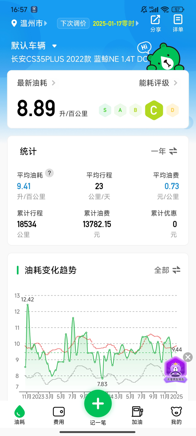 两万公里了留个纪念 当时冲着没有颗粒捕捉器买的22款35,主要小县城短途上下班,均速24,油耗9.4,爬坡走山路没有缺动力的时候。车机油耗压根不准,每次短途显示6个多,加油的时候显示8个多,小熊油耗算一下9个多。 车子去4儿子店只为了保养,去修车店只为了补胎,两年多啥事也没有挺好。 车机拉胯,冬天天冷经常不识别音乐U盘,得重新拔出来插回去才行,买来已经死机了5次。死机后自动重启还行,最新版本导航更不敢指望了。 有没有车友知道钥匙怎么让车子鸣笛,一直用app寻车,挺麻烦