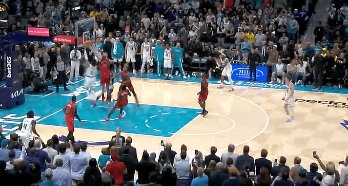 拉梅洛-鲍尔加速突破飞身上篮打进,黄蜂领先2分剩1秒