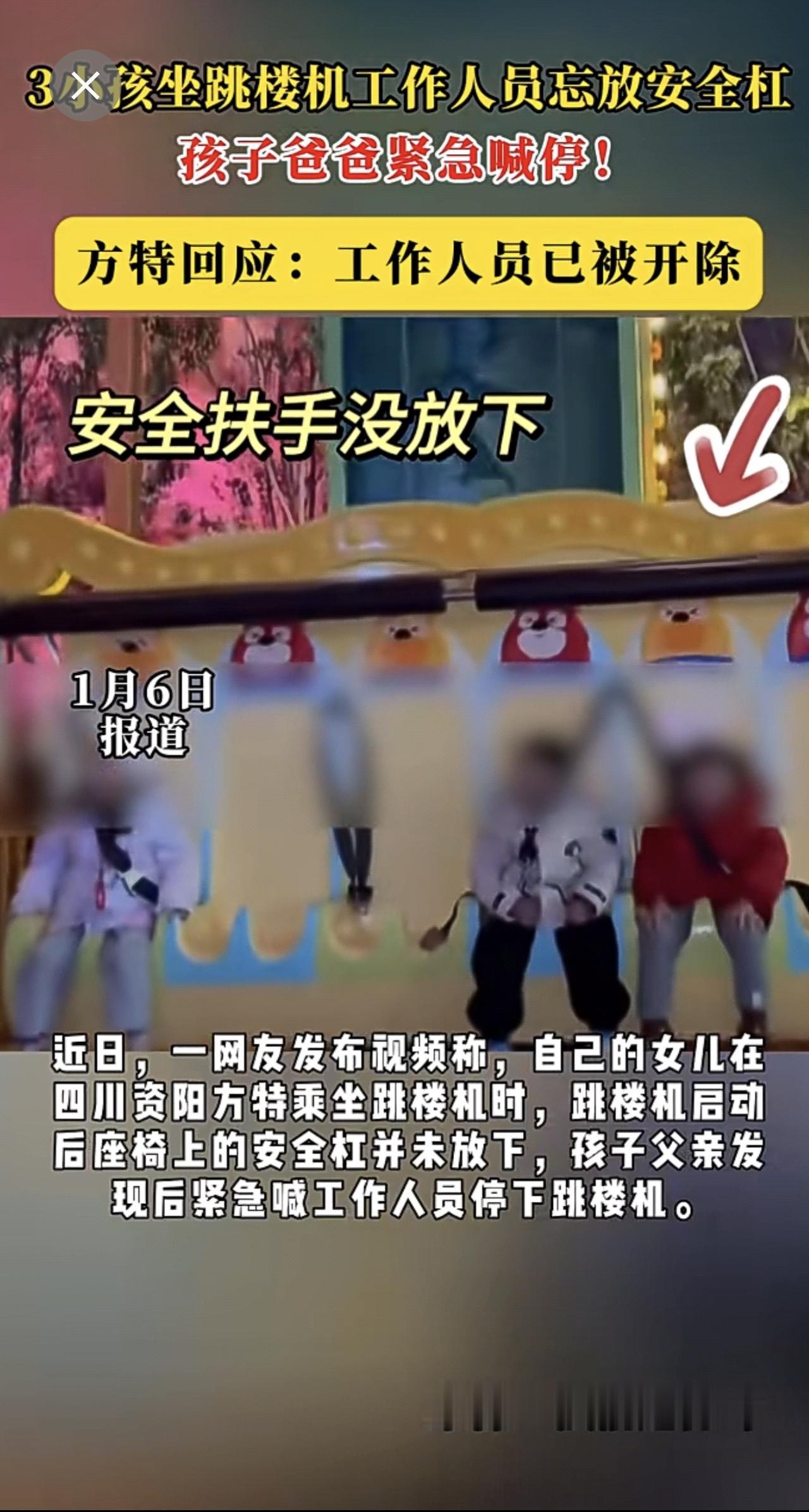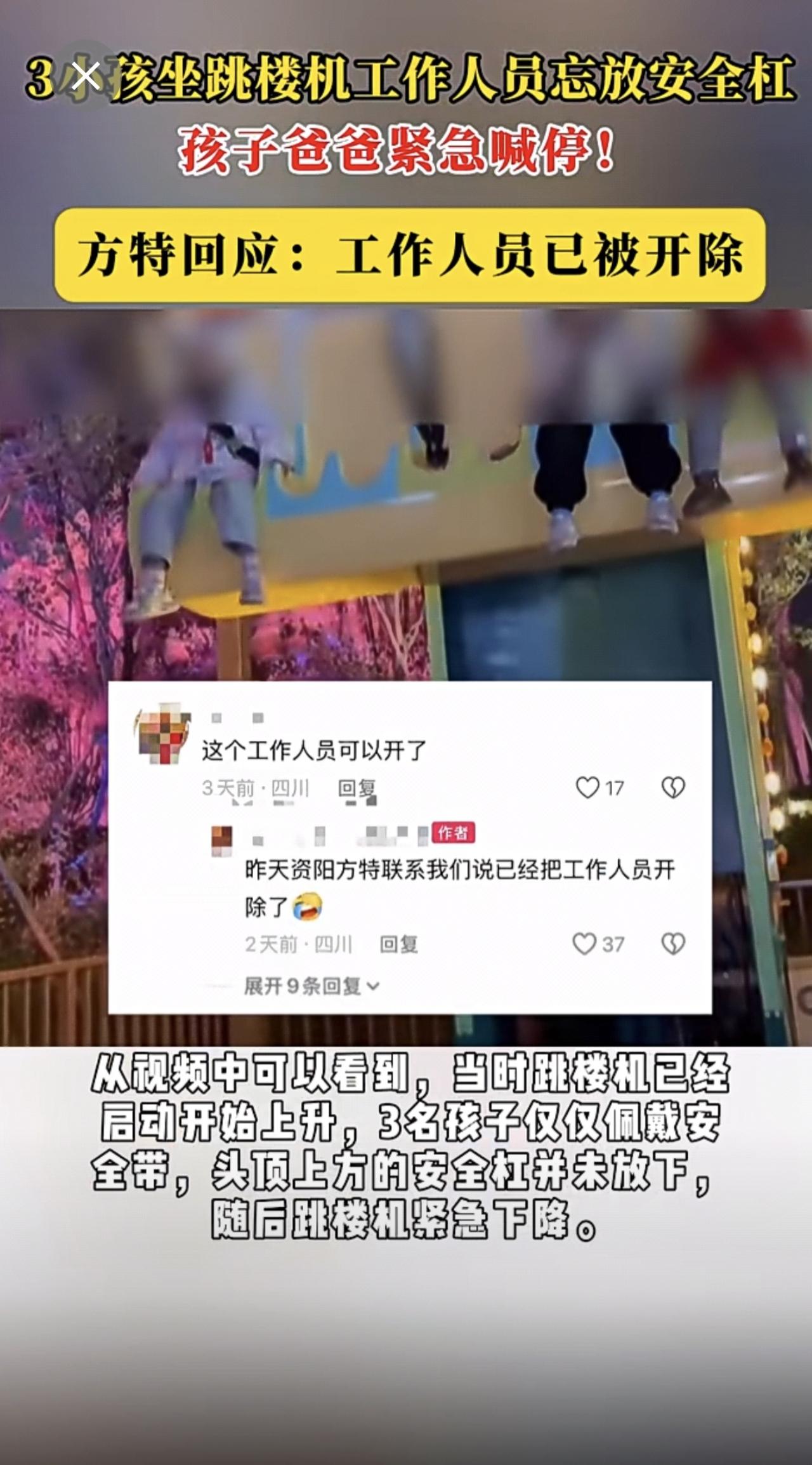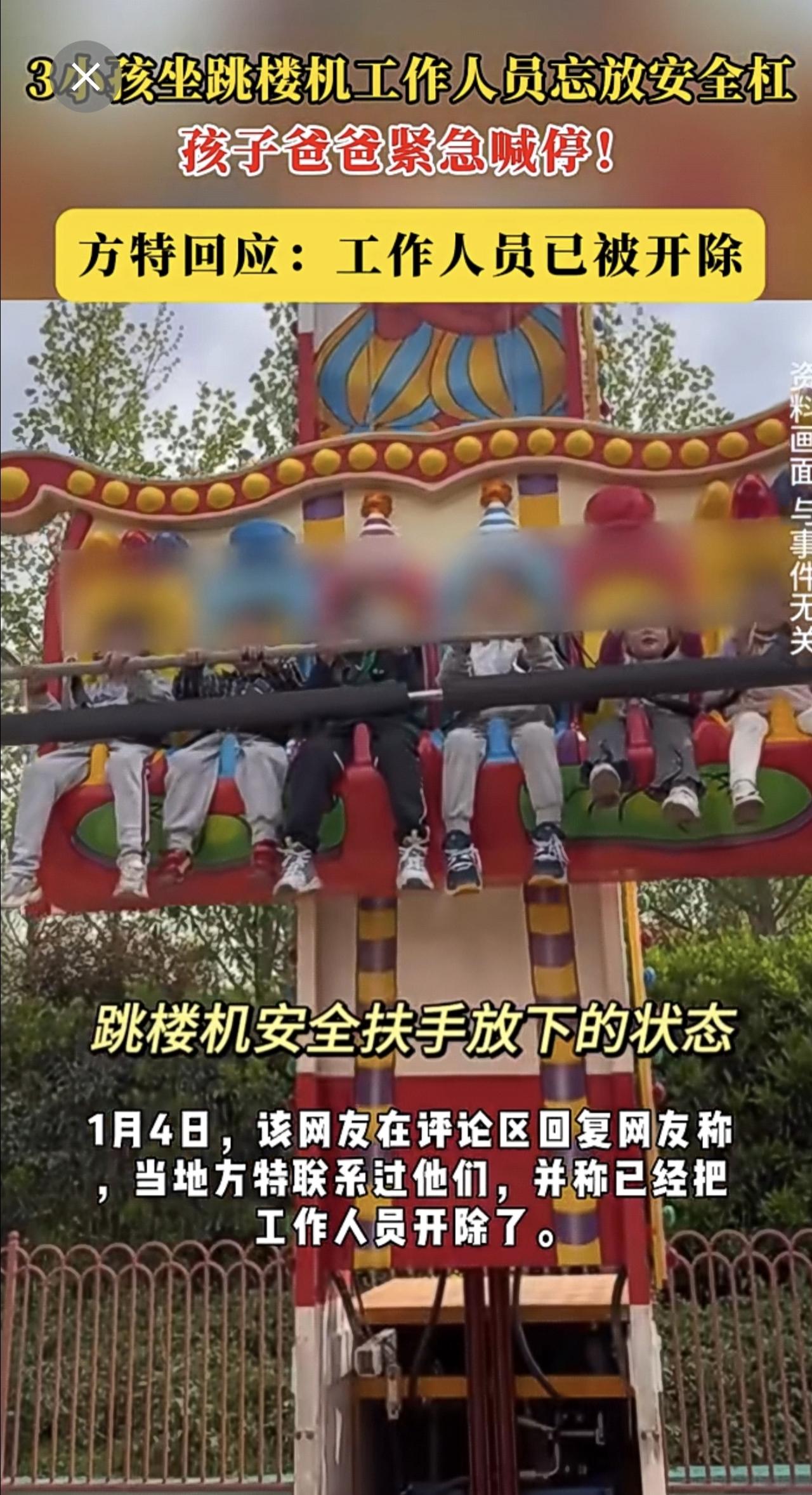 3小孩坐跳楼机工作人员忘放安全杠,孩子爸爸紧急喊停!方特回应:工作人员已被开除。