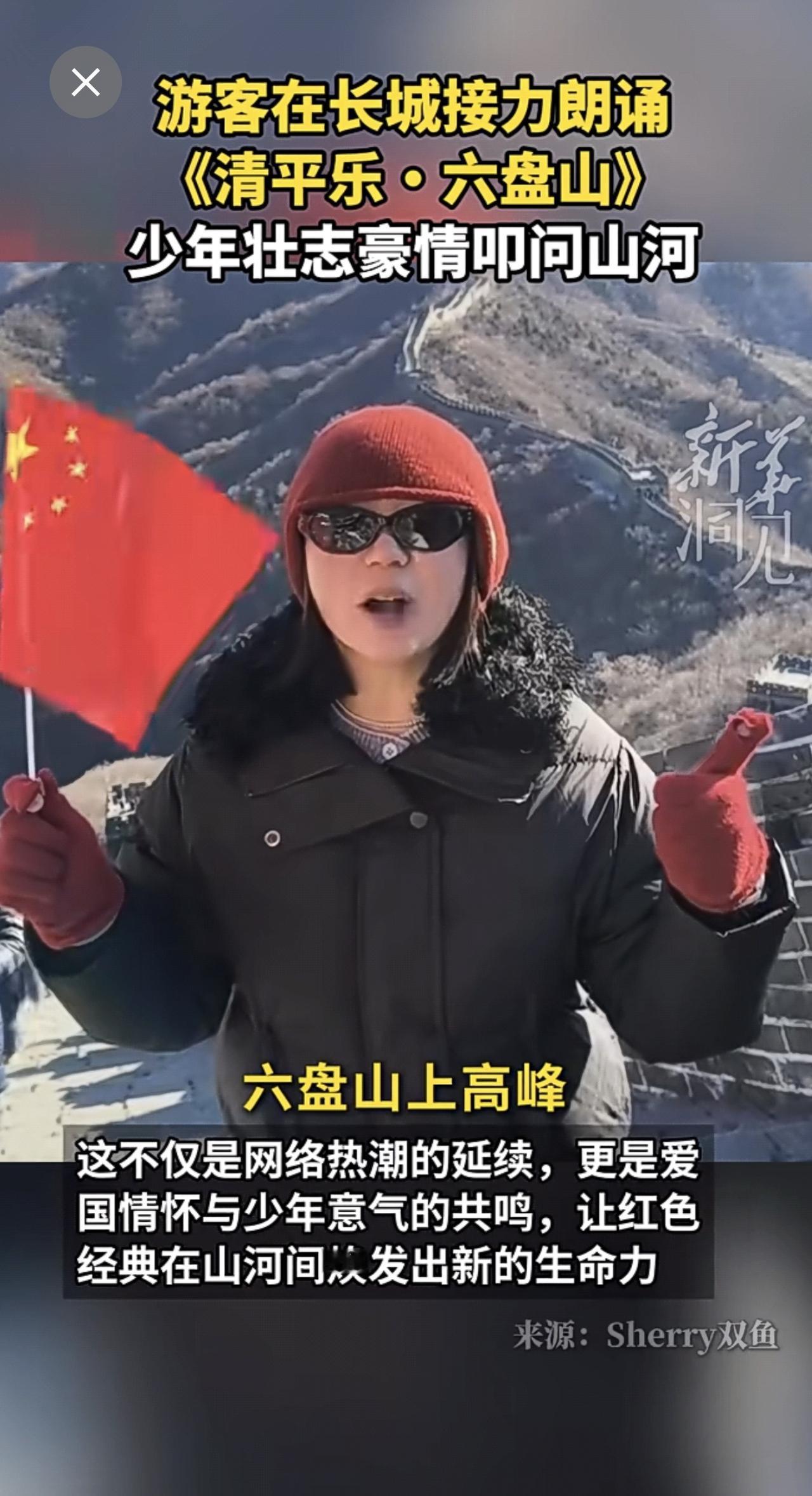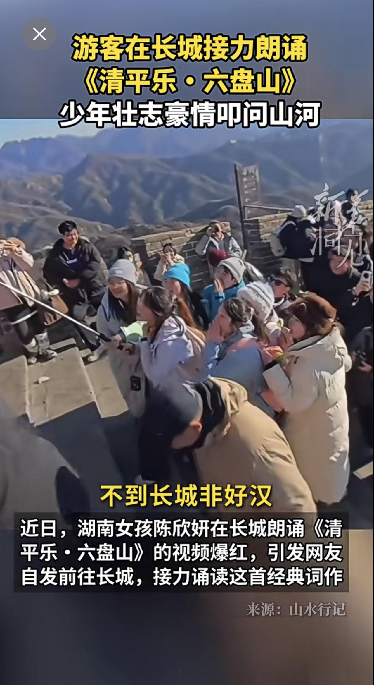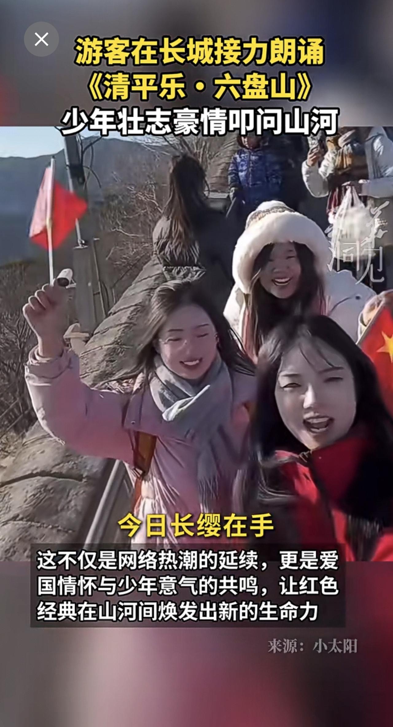 游客在长城接力朗诵《清平乐·六盘山》,少年壮志豪情叩问山河!