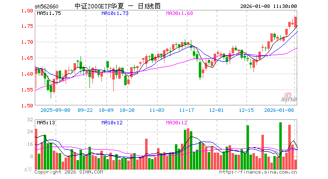 1月8日,截止午间收盘,中证2000ETF华夏(562660)涨1.08%,报1.778元,成交额1076.91万元。中证2000ETF华夏(562660)重仓股方面,天奥电子截止午盘涨3.32%,国恩股份跌2.94%,亚太股份跌1.56%,宝胜股份涨1.79%,绿色动力涨0.58%,春秋电子涨0.61%,光电股份涨3.48%,麦克奥迪涨1.21%,杰普特跌3.25%,道恩股份涨0.53%。