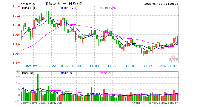 1月8日,截止午间收盘,消费龙头ETF(159520)跌0.65%,报1.064元,成交额1012.62万元。消费龙头ETF(159520)重仓股方面,贵州茅台截止午盘跌0.90%,格力电器跌0.05%,伊利股份跌3.94%,牧原股份跌0.79%,赛力斯跌2.02%,福耀玻璃跌1.77%,温氏股份涨0.06%,山西汾酒跌1.10%,海尔智家跌0.61%,分众传媒涨0.40%。