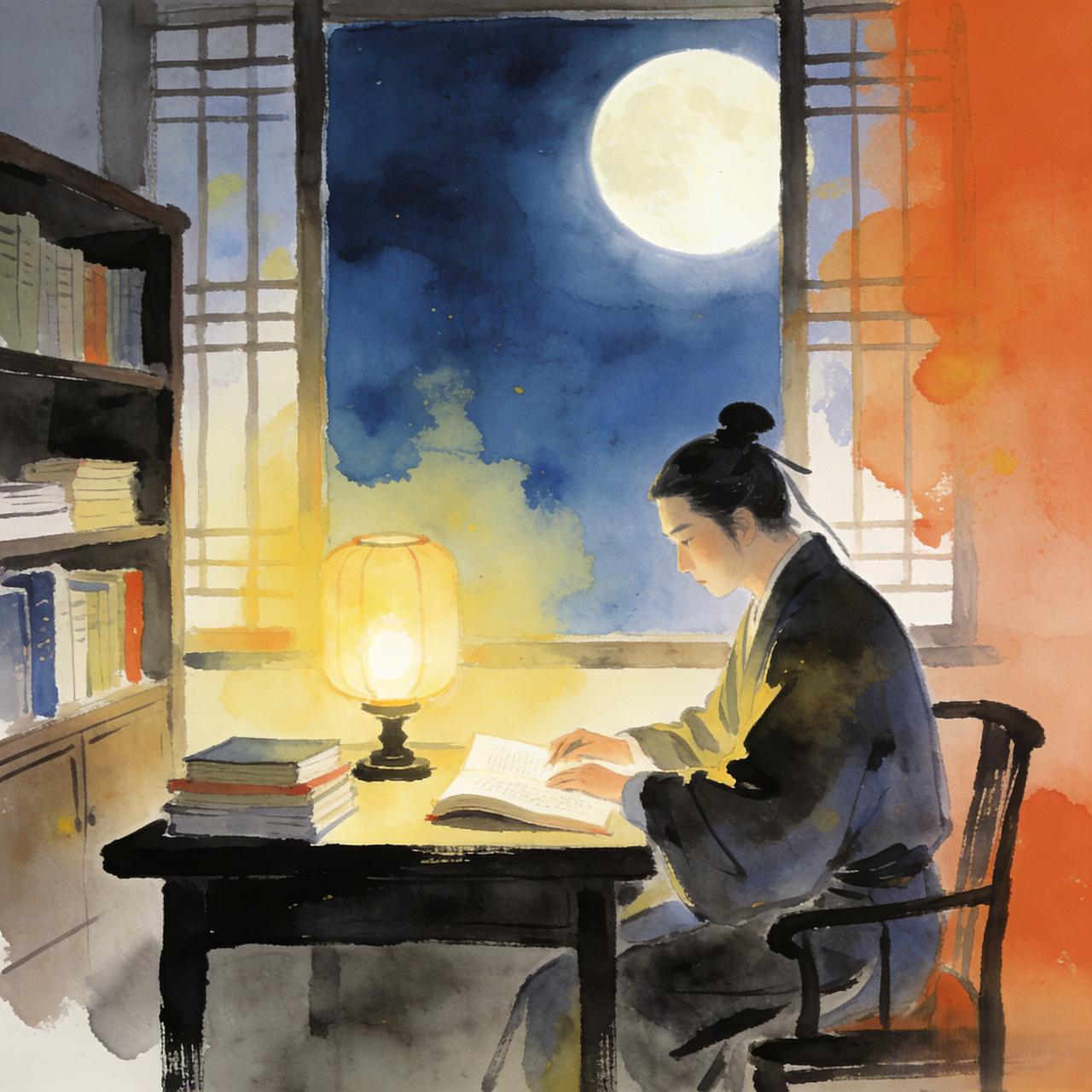 上联:月照荷塘静 下联:灯温书卷深 灯火暖照书页,深化静谧中的思想之境,由自然转