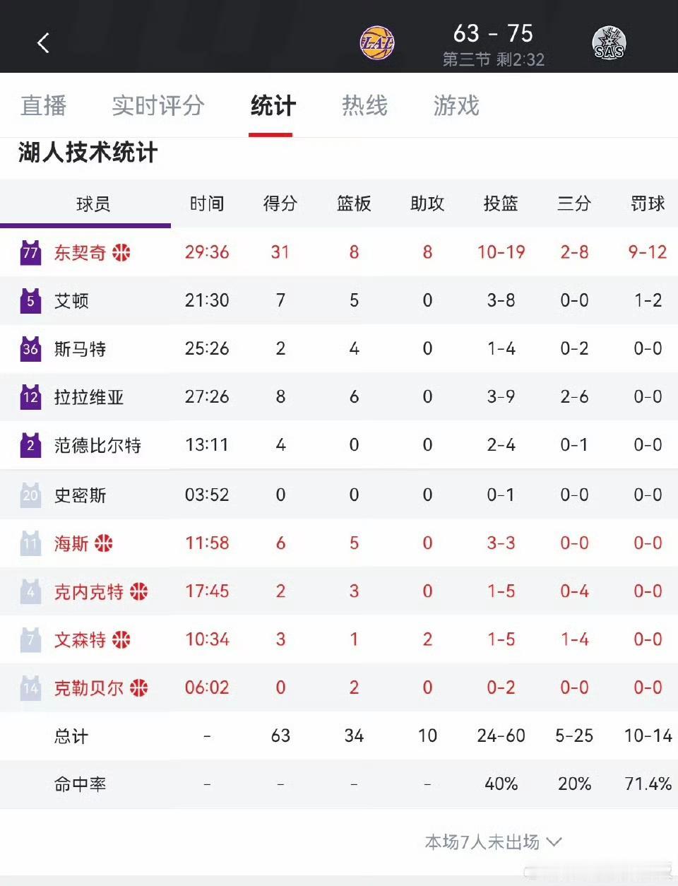 今天最希望湖人赢球的,除了詹姆斯球迷,应该就是詹黑了吧?湖人输了,没有詹姆斯,赢不了球;湖人赢了,有詹姆斯赢不了马刺,没有赢。 如果马刺在末节前把湖人打死,这样裁判操作的空间会小很多。 果然马刺一顿乱揍,将分差拉大到12分。湖人63-75马刺。 湖人少了两个得分点,东契奇31分,没有第二个得分上双的。