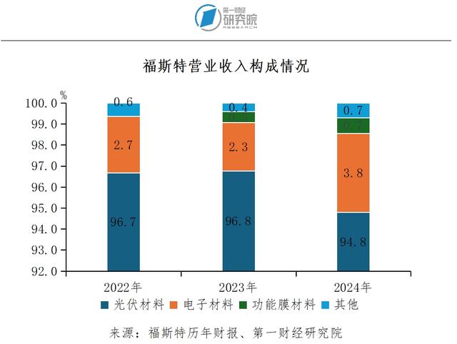 随着国内光伏行业快速发展,光伏产业的竞争日趋激烈,市场需求也在不断变化。为继续保持竞争力,福斯特进一步实施了产品跨业的经营战略。2015年福斯特提出“立足光伏主业,大力发展其他新材料产业”的发展战略,决定将产业方向从光伏封装材料扩展到电子材料等新兴产业领域。对此,林建华表示,鸡蛋不能放在一个篮子里。将产品延伸至新材料领域,福斯特不仅提升了自身产品的多样性,还增强了盈利能力。2024年,福斯特电子材料营业收入7.2亿元,同比增长38.2%。目前,福斯特形成了光伏材料、电子材料和功能膜材料的多元化业务布局,在内部管理上成立了光伏材料事业部、电子材料事业部、功能膜材料事业部、涂布材料事业部四大事业部。