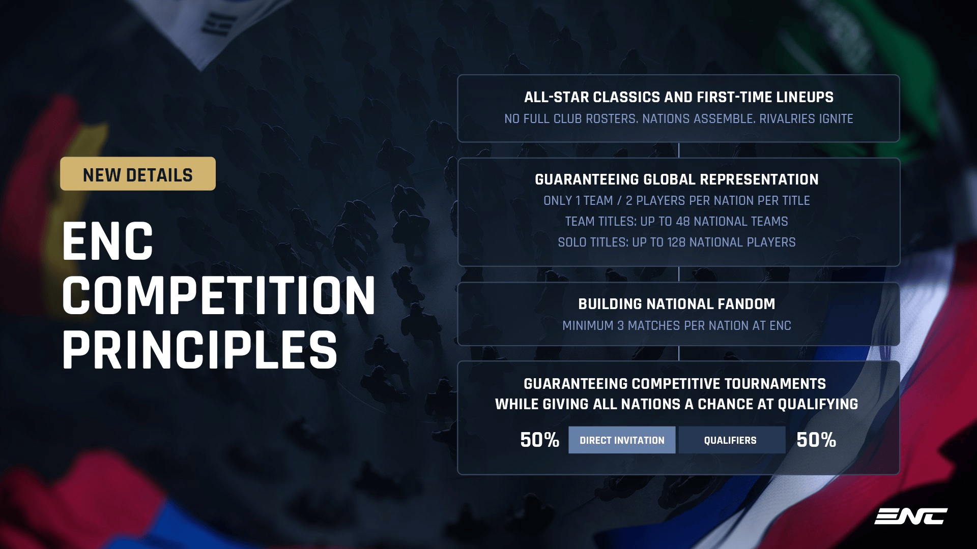 ENC将禁止参赛队伍以任何一支现有俱乐部的完整名单出赛,每支代表队必须由来自不同俱乐部的选手组成。