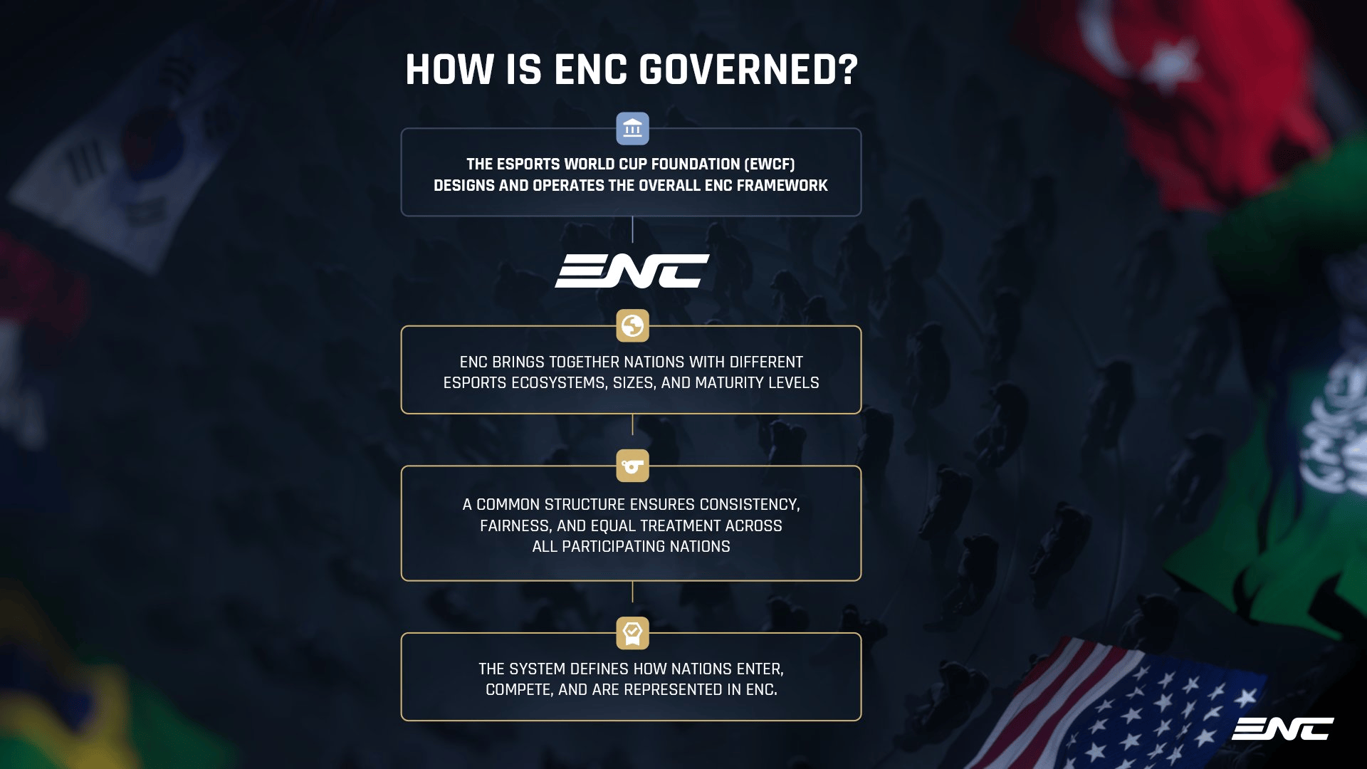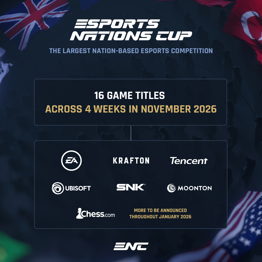 首届ENC将在2026年11月于沙特阿拉伯利雅得举行。赛事将持续四周,涵盖16个比赛项目。目前为止已经确认的合作伙伴为:EASports、Krafton、腾讯、育碧、SNK、MOONTON,以及Chess.com。