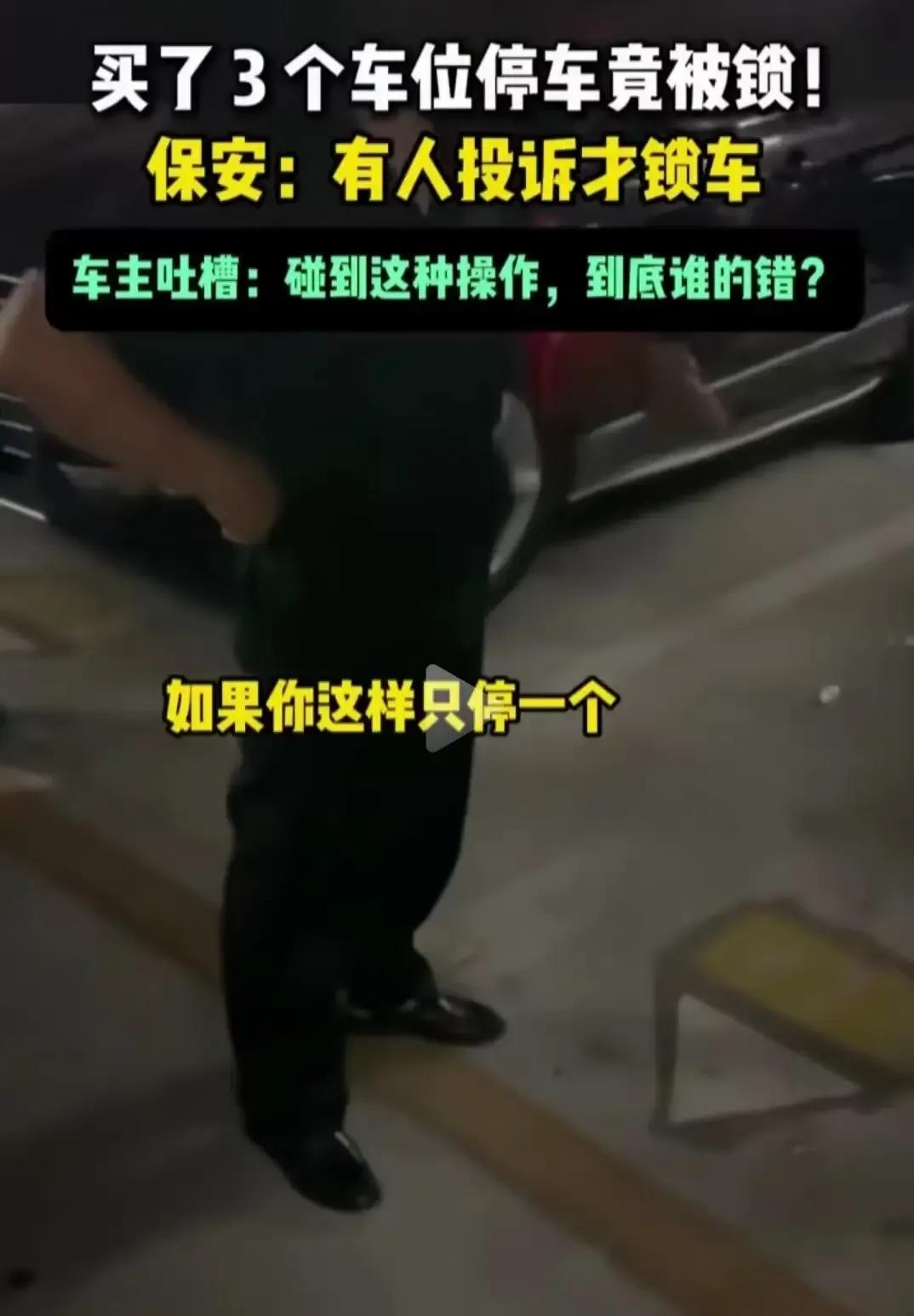 男子横着停车占了3个车位,有人向物业投诉,物业派保安把车锁了!男子:“3个车位都