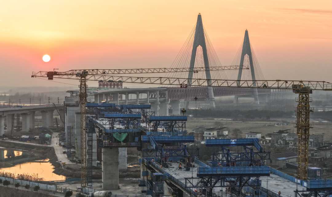 1月7日,安徽省马鞍山市当涂县境内,巢马城际铁路长江公铁大桥公路接线工程的工地上依旧热火朝天,工人们正奋战在桥墩之上,全力推进工程进度。