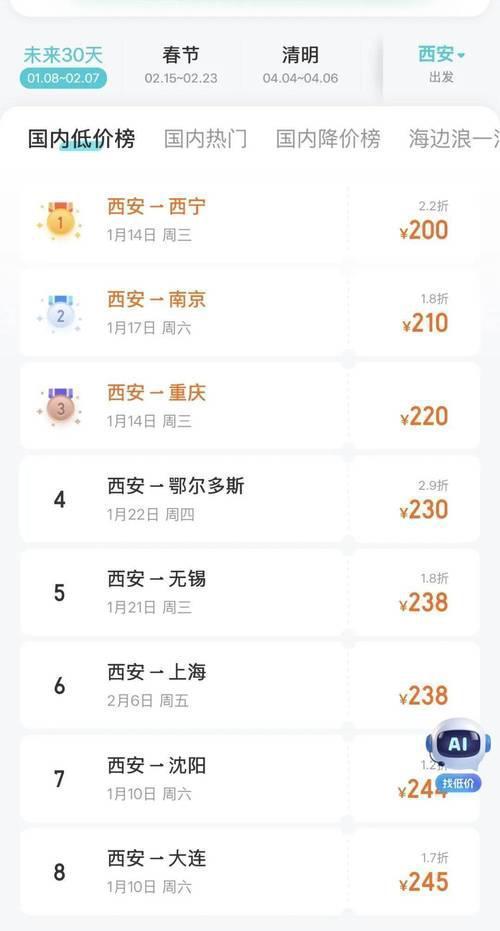 元旦过后,国内多条航线机票价格“大跳水”! 部分低至1折(如广州至上海210元,1.1折),消费者选择错峰出游。业内人士预计1月中下旬学生放寒假后价格将波动。 这波“低价潮”引发了不少消费者的抢购热情,纷纷抓住错峰出游的好时机,计划在春节前后出行。 业内人士分析,这轮“跳水”主要受节后旅游淡季和市场竞争影响。随着假期结束,航空公司为激发客流,纷纷推出优惠促销,吸引旅客提前出行。专家还预测,等到学生寒假开始后,价格可能会出现一定波动,但整体仍会保持较为优惠的趋势。 这也反映出旅游市场的“季节性波动”与“价格策略”。对于消费者来说,现在正是“捡漏”的好时机,不仅能节省出行成本,还能避开春节期间的高峰,享受更舒适的旅途体验。 当然,购票时也要注意选择正规渠道,留意退改政策,确保出行顺利。未来几周,机票价格或许还会有变化,但这波“低价风”无疑为广大出行者提供了绝佳的机会。 你打算趁这个时候提前安排旅行吗?还是等待更优惠的折扣?无论如何,把握当下,合理规划,出行的快乐就会更轻松、更实惠!