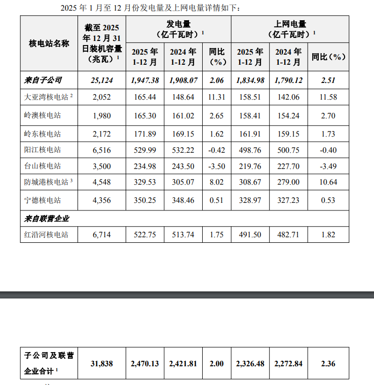 中国广核2025年核电机组总发电量同比增2%,总上网电量同比增2.36%