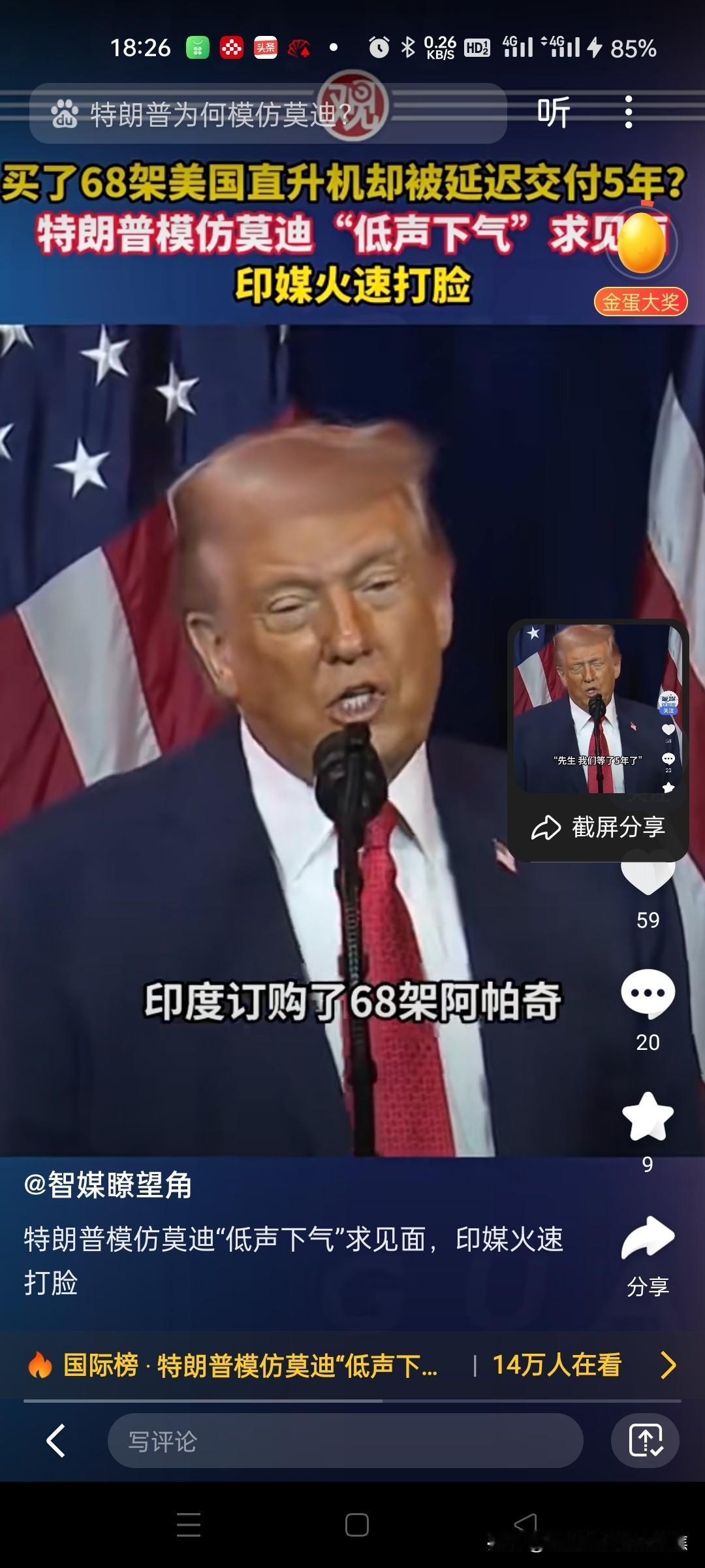 特朗普模仿莫迪低声下气求见面 美国总统特朗普在提及印度采购68架阿帕奇直升机延迟
