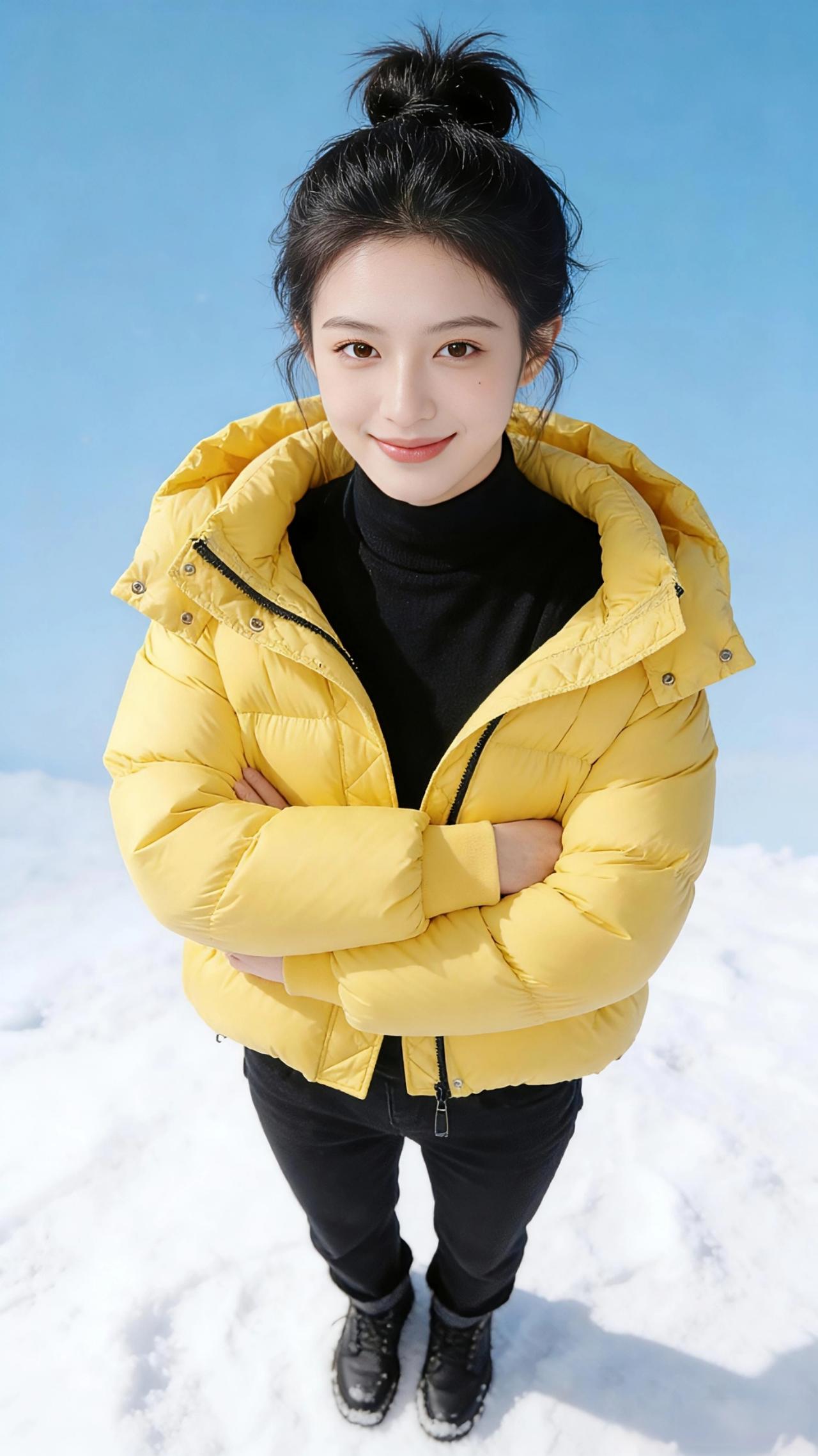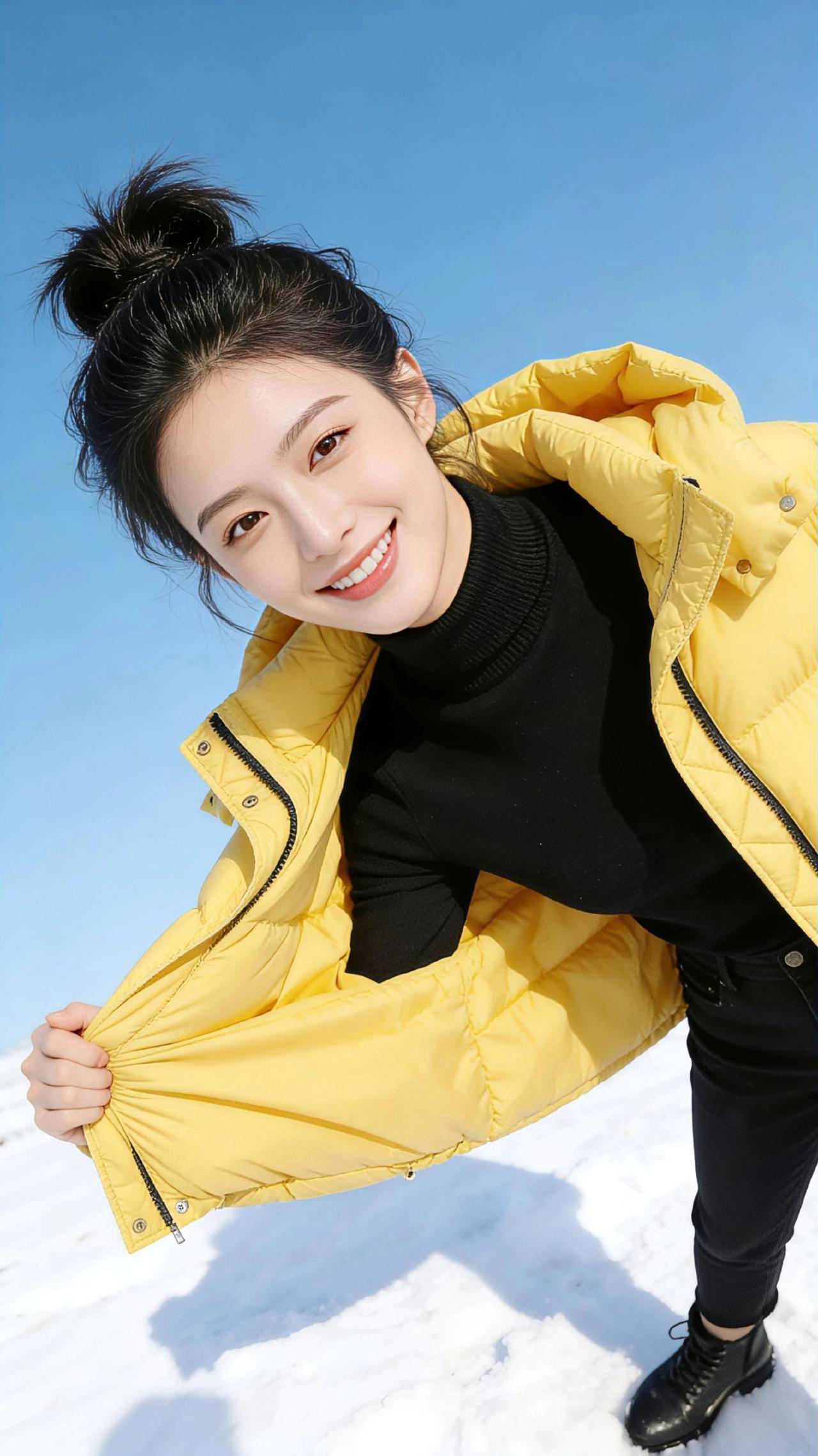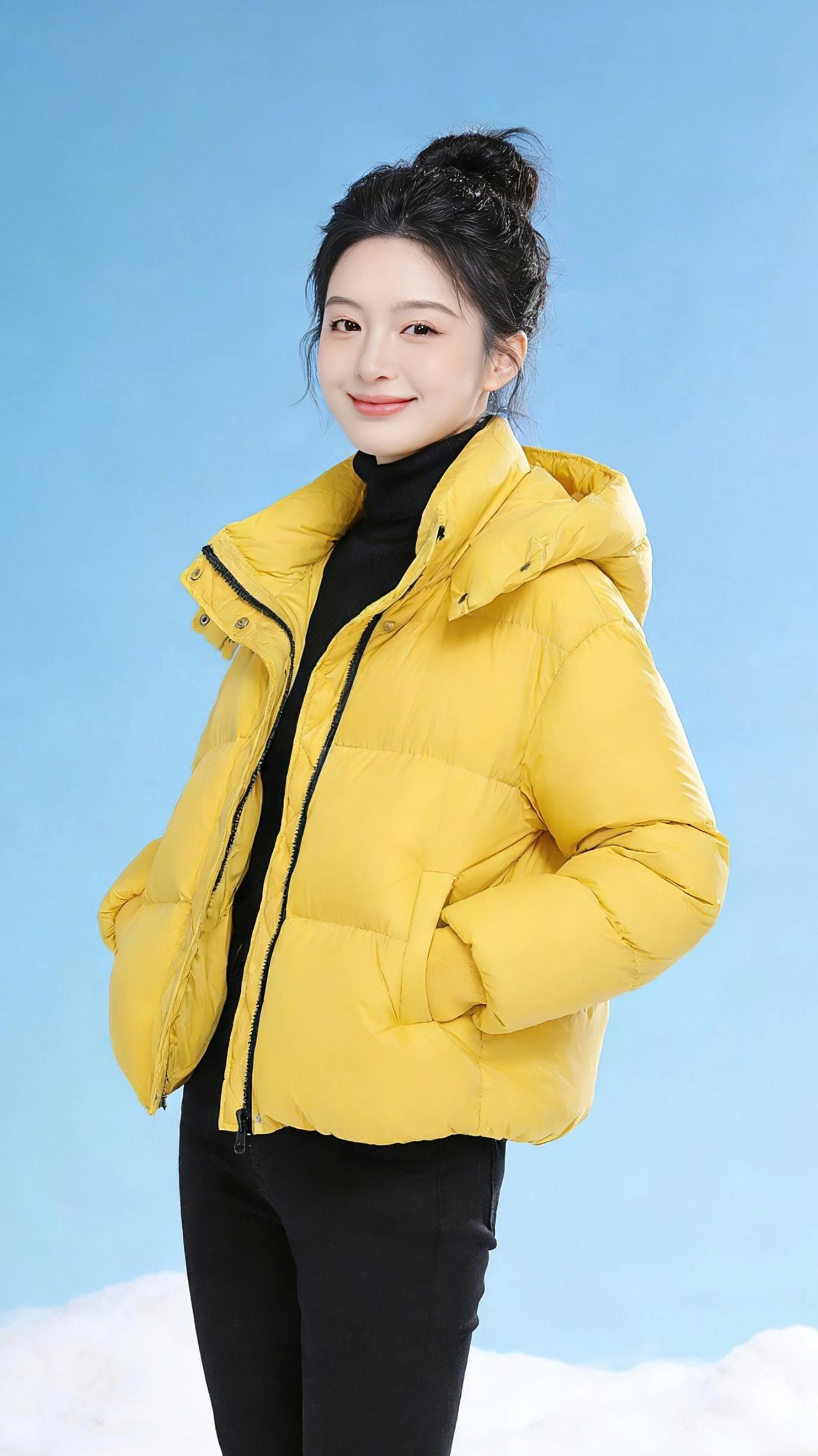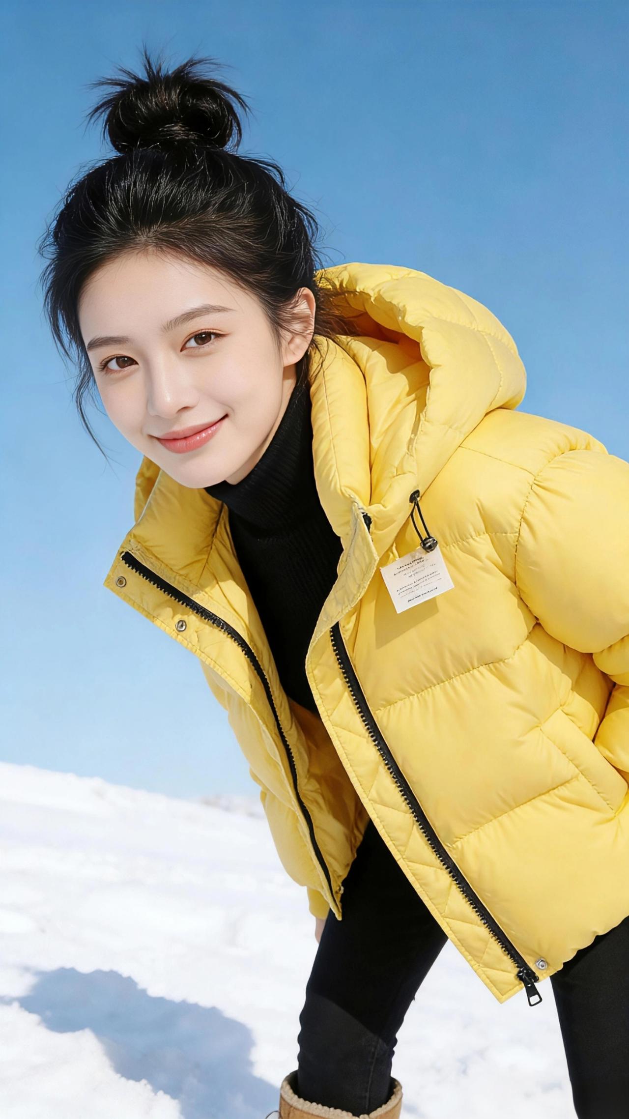 雪野黄杉 冬日的雪场是被揉碎的云絮,铺展在澄澈的蓝天之下。明黄的羽绒服像一截撞入纯白的暖阳,在雪色里炸开温柔的光。 丸子头的碎发被寒风拂起,衬得脸颊愈发明净。指尖轻扯羽绒服的边角时,蓬松的面料鼓胀出柔软的弧度,像揣着一团未融的春光。手插进口袋的瞬间,暖意便从绒面里漫出来,将冬日的冷意隔绝在外;微微俯身时,衣摆的标签轻晃,似是雪地里开出的一朵小纸花。 双臂交叠的刹那,明黄与皓白撞出鲜活的层次感,黑高领的内敛衬得黄色更显明媚。雪地的反光吻着衣料的纹路,每一道压线都盛着细碎的光,仿佛把冬日的阳光缝进了衣摆。 在这片纯白的天地里,这件黄羽绒服不是御寒的衣物,而是揉进冬日的一抹甜,是雪地里跳动的欢喜,让凛冽的风都裹上了温柔的温度。高级感穿搭 新年穿搭 小个子穿搭