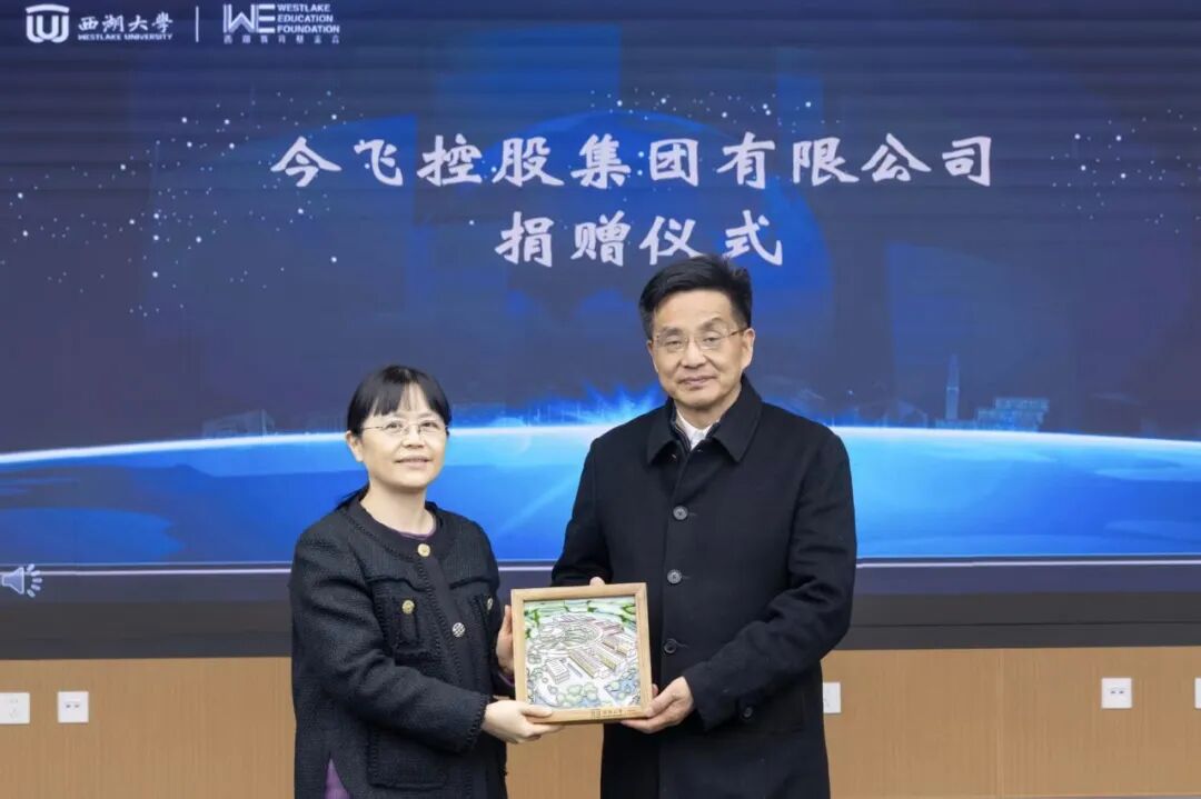 在今飞控股捐赠签约仪式上,西湖大学代表毕宪玲女士与集团代表金景海先生正式签订捐赠协议,建行金华分行副行长叶进、西湖大学副校长朱晓芸、葛炳灶董事长共同见证这一重要时刻。随后,毕宪玲女士向葛炳灶先生颁发捐赠证书,朱晓芸副校长代表学校回赠纪念品,标志着双方合作迈入实质性落地阶段。