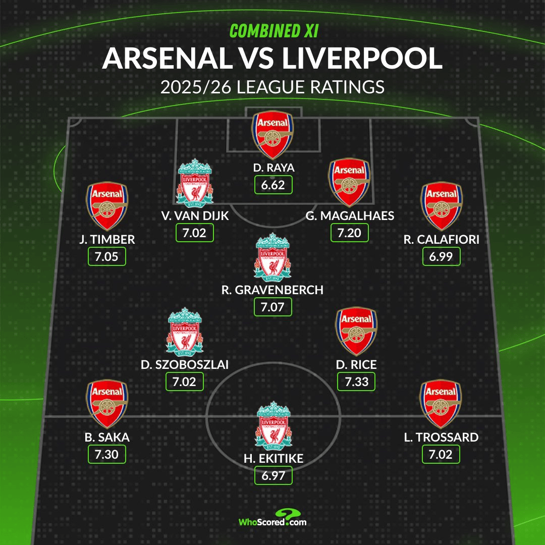 虎扑01月08日讯英超阿森纳对阵利物浦的焦点战即将在明天4:00开战,数据网站whoscored也根据本赛季的球员评分评选阿森纳与利物浦的联合最佳阵容。