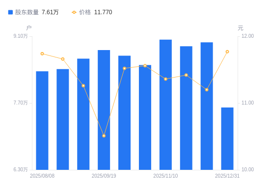 近一年(2024年12月31日至2025年12月31日),千方科技A股股东户数从8.07万户,减低至7.61万户,降幅5.74%,区间股价上涨11.46%。