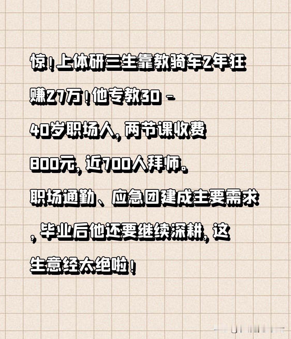 惊!上体研三生靠教骑车两年赚27万!他专门教授30 - 40岁职场人,两节课收费800元,近700人前来拜师。职场通勤、应急团建是主要需求,毕业后他还会继续深耕,这生意经太妙了! 自行车教培