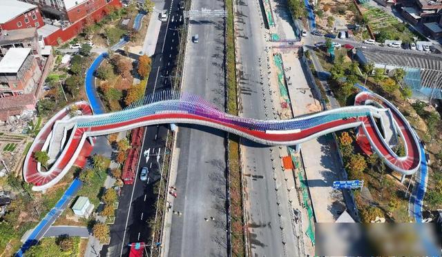 横跨黄龙南大道的4号天桥,空中俯瞰,宛若一道绚丽的彩虹。