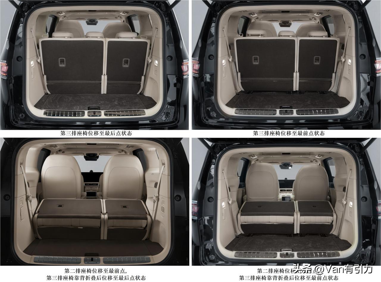 工信部车展之第403批——智界V9,这次申报的3款都是增程车。 其实前些日子各种渲染图出了不少,证件照也确实八九不离十,大家对这车似乎已经没啥新鲜感了。简而言之,这是一台风格中规中矩的偏商务属性MPV。 不过重点参数还是得说说的,比如长宽高5359/2009/1859 mm,轴距3250 mm(小于理想Mega、魏牌高山9);整备质量2750-2940kg,说明轻量化做得不算优秀但也绝不算差;传统7座(2-2-3)布局;增程器是最大净功率为105kW的SQRH4J15发动机。 意料之中但VAN哥还是觉得有点遗憾的细节是第三排座椅(图5)。显然为了保乘坐舒适性而彻底放弃装载灵活性,选用了最最最保守的座垫可前后移动(目测10厘米左右,高配车大概率可以选装电动伺服机构)但不可翻转方案。这方面暂时没看到一丁点创新迹象[尬笑] 当然,大多数目标用户并不在乎后备箱能不能装进洗衣机,所以这个事儿咱们就过了[微笑] 对了,255/55R19和255/50R20两种轮胎规格(Mega和高山9都只是18寸),意味着轮包占用车内空间不会太小,所以第三排横向空间应该没啥惊喜……什么是理想的家庭座驾?智界v9
