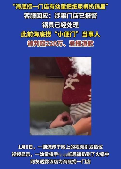 幼孩的举动是谁的错? 1月8日,一则流传于网上的视频引发热议。视频显示,一幼童将手中的纸尿裤扔进火锅中,网友透露该店为海底捞一门店。 有网友愤怒表示,“希望引起重视,尽快处理。”客服回应:涉事门店已报警,锅具已经处理。 这则关于幼童将纸尿裤扔进火锅的视频引发热议,反映出多方面的社会关注和担忧: 食品安全与卫生问题:幼童在火锅中扔纸尿裤,极易造成食材污染,存在严重的食品安全隐患。这不仅影响消费者的健康,也损害了餐饮企业的声誉。 儿童安全与教育:幼童的行为可能反映出家庭或监护人的教育问题,也引发公众对儿童安全、监护责任的关注。儿童在公共场所的行为应得到适当引导和监管。 餐饮企业责任:事件中,涉事门店已报警,说明餐厅方面也在积极应对。公众期待企业能加强管理,确保食品安全,防止类似事件再次发生。 公众反应与社会舆论:网友的愤怒和关注,体现出公众对食品安全的高度敏感和重视,也呼吁相关部门加强监管,保障消费者权益。 应对措施:目前,涉事门店已采取措施(报警、处理锅具),但事件也提醒行业加强员工培训、提升卫生管理水平,建立更完善的安全措施。 总结:此事件提醒我们,食品安全不仅关乎监管部门的责任,也需要企业的自我管理和家庭的教育引导。同时,公众的关注也促使相关方面不断完善制度,保障消费者权益和公共安全。未来,增强食品安全意识和儿童安全教育,将是预防类似事件的重要方向。