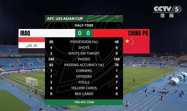 上半场尽管伊拉克队在控球时间上占优,但中国队在门前机会更多,制造出有威胁的传球和射门次数也更多。