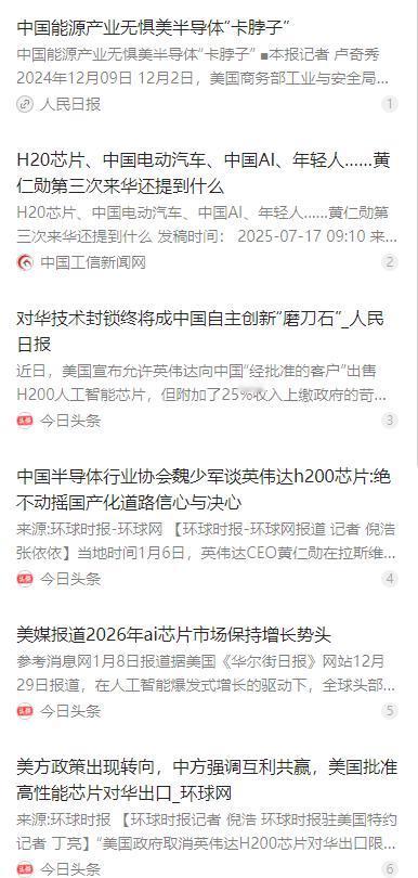 迟迟等不到中方审批,英伟达输了个精光!说白了,特朗普和黄仁勋认为,只要他们放开H200的芯片,中国肯定急着接盘,这下还能给英伟达发个“大大的年终奖红包”。甚至特朗普还藏着掖着有点不太想卖,加了一点税,就是美国认为中国别无选择,开始坐地起价了。   麻烦看官老爷们右上角点击一下“关注”,既方便您进行讨论和分享,又能给您带来不一样的参与感,感谢您的支持!   当地时间 2025 年 12 月 8 日,特朗普在社交媒体上高调宣布,允许英伟达向中国 “经批准的客户” 出口 H200 芯片,还特意加上了 25% 的销售分成要求。在他和黄仁勋看来,这波操作稳赚不赔,中国没理由不抢着接盘,既能给英伟达清库存、救业绩,还能让美国坐收渔利。   可他们万万没料到,中方的审批迟迟没有动静,原本盘算的 “年终奖红包” 彻底泡汤,英伟达反而陷入了骑虎难下的困境。这背后,是美国对中国科技产业的反复算计,也是中国坚守供应链安全的战略定力。   H200 芯片并非英伟达最新顶级产品,而是仅次于 Blackwell 系列的次顶配型号。拜登政府时期,这款芯片被列入对华禁售名单,英伟达只能给中国市场提供性能大幅缩水的 H20 减配版。随着全球 AI 热潮降温,英伟达囤积了大量 H200 库存,急需找到销路盘活资金。   黄仁勋对此急得像热锅上的蚂蚁,2025 年一年就三次访华,明里暗里给 H200 吹风。他在各种场合强调,H200 是符合中美监管要求的合规产品,内存带宽出色,特别适合大语言模型等 AI 场景,字里行间都在暗示这是为中国市场量身打造的 “诚意之作”。   他还多次游说美国政府,直言英伟达因对华出口管制,在华高端芯片市场份额已从 95% 骤降至 0%,再不出手就会彻底失去这块 500 亿美元的巨大市场。这番 “苦情牌” 加上英伟达的游说攻势,最终让特朗普政府松了口。   特朗普的算盘打得更精,一方面想通过出口 H200 赚取高额分成,给美国经济 “添砖加瓦”;另一方面又守住 Blackwell 等顶级芯片的禁售红线,试图用次优产品绑定中国市场,扼杀中国本土芯片的成长空间,可谓经济利益和政治算计两手抓。   可美国政府忘了,中国早已不是只能被动接受的一方。近年来,美国频繁升级半导体出口管制,把 140 家中国相关企业列入 “实体清单”,从设备、软件到材料全方位打压,反而倒逼中国加快了国产替代的步伐。   如今,电源管理、传感器等不少芯片品类已实现国产化突破,主控 MCU 芯片也完成研发布局推向市场,国产 AI 芯片更是被纳入官方采购清单。中国半导体行业协会副理事长魏少军明确表示,绝不会因短期的产品引入,动摇国产化道路的信心与决心。   更让英伟达头疼的是,中国市场早已不是它一家独大。谷歌的张量处理器、亚马逊的自研芯片都在强势崛起,超威半导体也计划 2026 年推出竞品,这些企业都在趁机抢占英伟达留下的市场空白。   中方迟迟不批 H200 的审批,核心原因是出于供应链安全的战略考量。此前英伟达 H20 芯片就被曝出存在 “追踪定位” 和 “远程关闭” 的安全漏洞,让中国企业不得不提高警惕。美国政策反复无常,时而禁运时而松绑,也让中方难以确认其真实战略意图。   中国外交部早已明确立场,一贯主张中美科技领域互利共赢,但前提是符合双方监管要求,保证产品安全稳定,而不是美方单方面设定规则、坐地起价。对于存在安全隐患、附加不合理条件的技术产品,中国绝不会草率放行。   截至 2026 年 1 月初,英伟达原本计划春节前交付的 4 万至 8 万颗 H200 芯片,因中方审批未通过仍躺在仓库里。库存积压导致资金回笼遇阻,而全球芯片市场竞争却在加剧,高盛预测的 3830 亿美元年销售额面临变数。   特朗普想靠 25% 分成捞取政治资本、限制中国科技发展的图谋,显然落了空。中国不仅没有急着接盘,反而在国产化道路上越走越稳,在 AI 领域的发展势头丝毫未减。黄仁勋当初 “伤害中国往往更伤害美国” 的警告,如今正在英伟达身上应验。   这场芯片博弈再次证明,科技霸权主义行不通,任何试图靠技术封锁、坐地起价获利的想法,最终都会自食恶果。中国坚持自主创新与开放合作并行,既不盲目排外,也不依赖外部供给,这才是在科技博弈中站稳脚跟的关键。   英伟达的困境,说到底是误判了中国的战略定力和国产替代的速度。在全球科技产业深度融合的今天,只有平等合作、尊重彼此安全关切,才能实现共赢,而不是抱着零和博弈的旧思维,最终落得竹篮打水一场空。