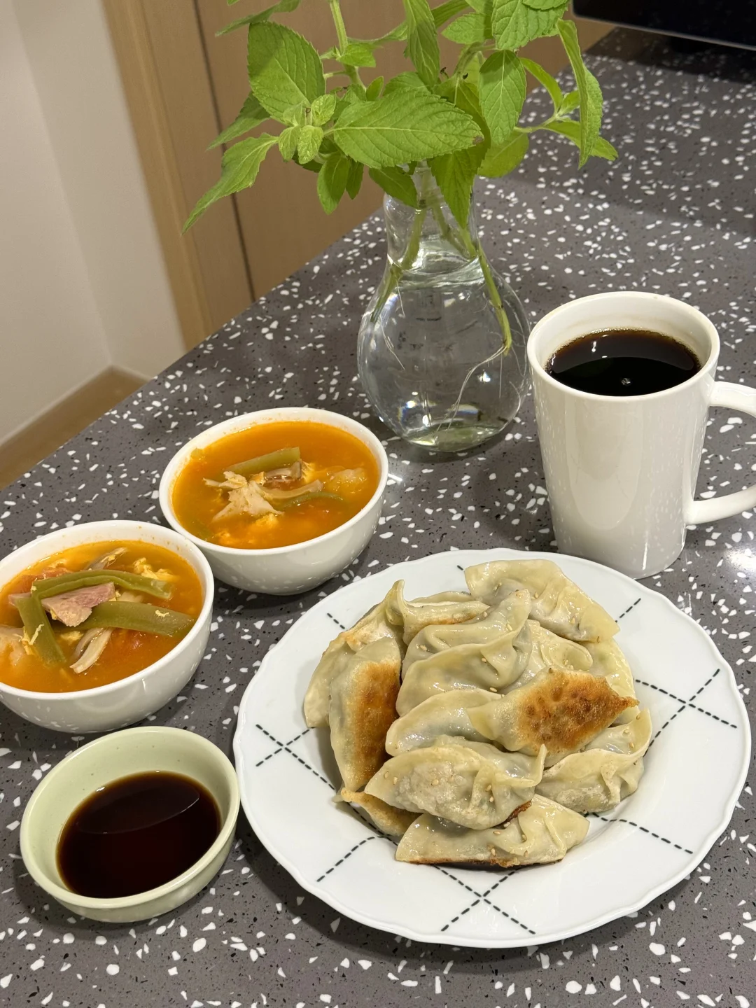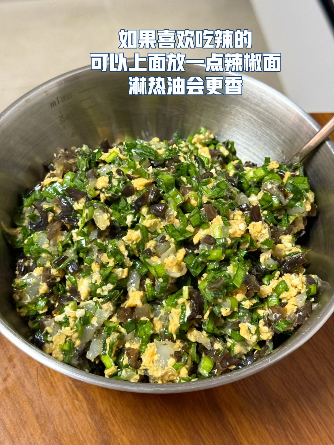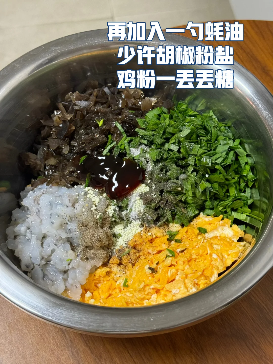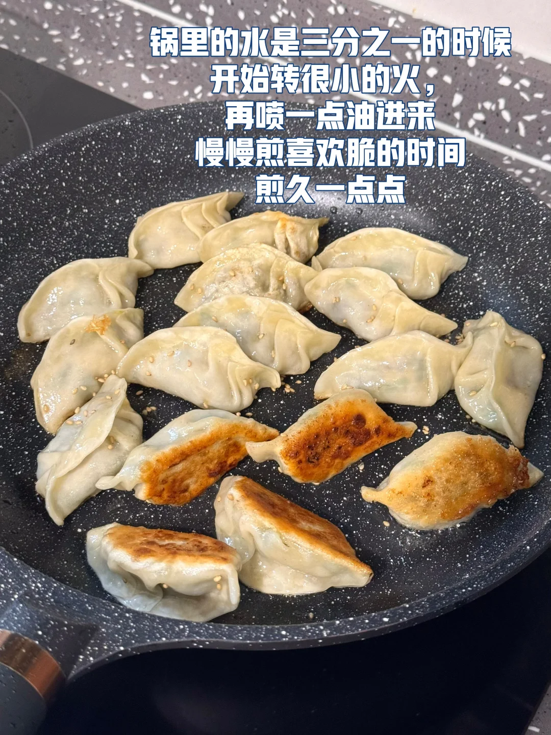 1. 材料可以根据自己的喜好去更换我这里放的有韭菜木耳鸡蛋虾仁用虾滑也可以 2. 再加入一勺蚝油少许胡椒粉盐,鸡粉一丢丢糖 3. 如果喜欢吃辣的可以上面放一点辣椒面淋热油会更香 4. 一次性可以多做一点,放冰箱,直接蒸或者煎起来都可以 5. 不粘锅里放入少许油冷冻过的饺子摆进去煎两三分钟,然后放入三分之一多一点的水盖上盖子开始煮 6. 锅里的水是三分之一的时候开始转很小的火,再喷一点油进来慢慢煎喜欢脆的时间煎久一点点
