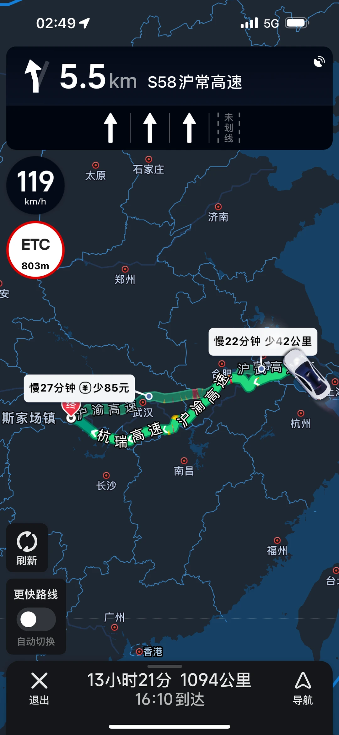 昨天半夜两点多出发的,晚上真的是开的很爽 一路不知道换了几条高速,安徽的时候被赶下国道开了会儿,目前开下来感觉今天其实真的不堵车,你们还好吗