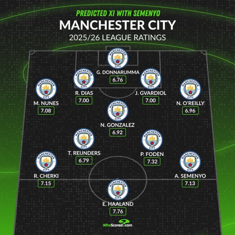 直播吧1月9日讯多方消息确认塞梅尼奥将加盟曼城,whoscored预测了曼城的主力阵容并附上本赛季英超场均评分。